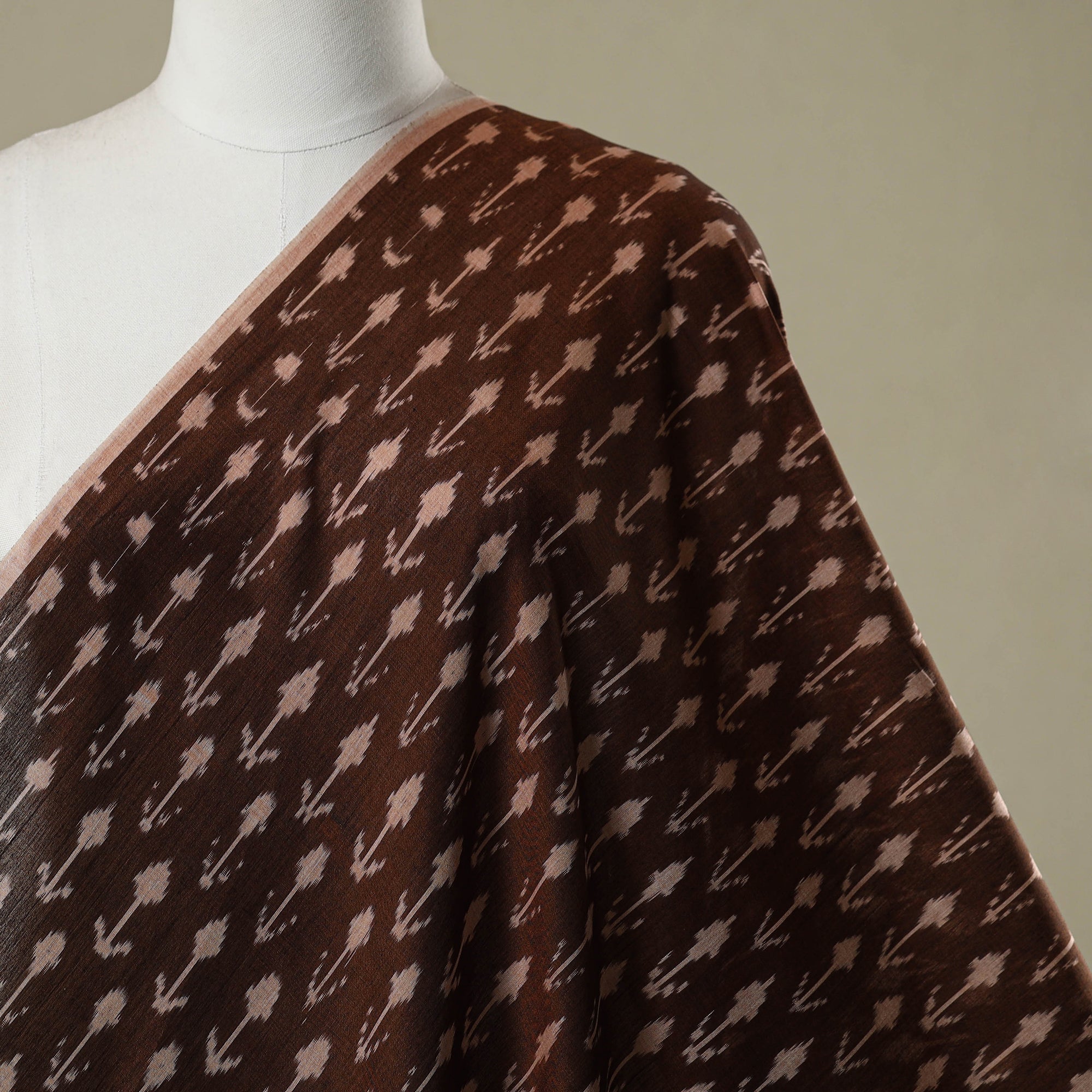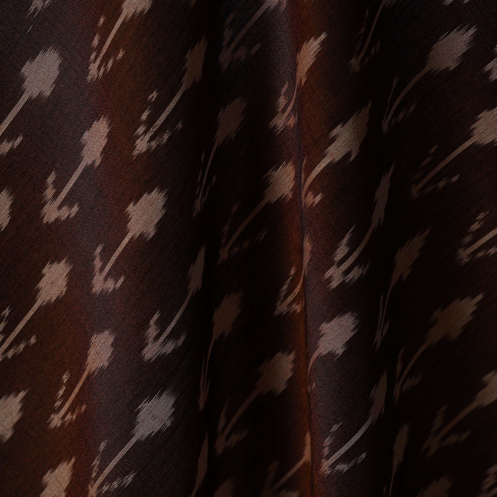 Explore brown mercerised cotton pochampally ikat fabric from Telangana. This fabric is created using the traditional resist-dyeing technique, where threads are dyed before weaving to form striking patterns. Known for its vibrant colors and smooth texture, it beautifully blends tradition with modern style. Perfect for making sarees, kurtas, home decor and creative fashion projects.