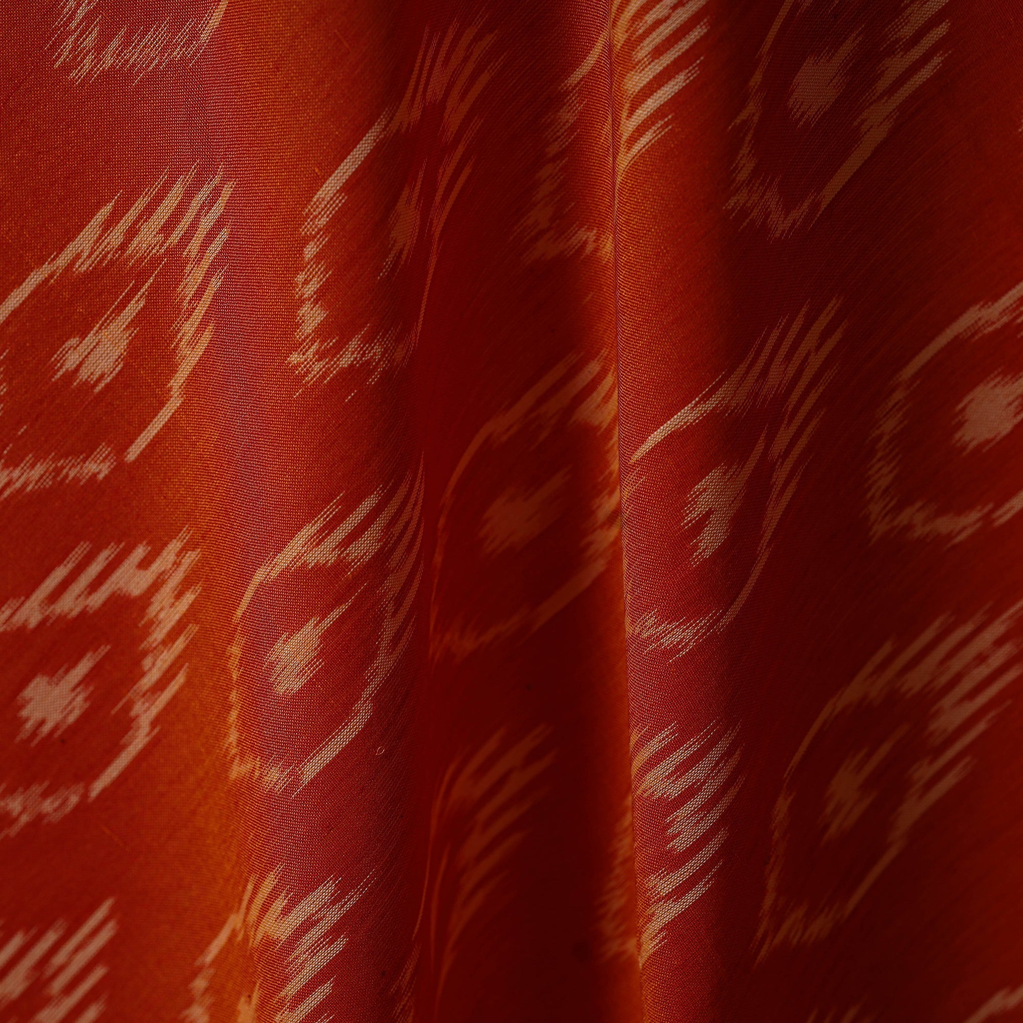 Explore orange mercerised cotton pochampally ikat fabric from Telangana. This fabric is created using the traditional resist-dyeing technique, where threads are dyed before weaving to form striking patterns. Known for its vibrant colors and smooth texture, it beautifully blends tradition with modern style. Perfect for making sarees, kurtas, home decor and creative fashion projects.
