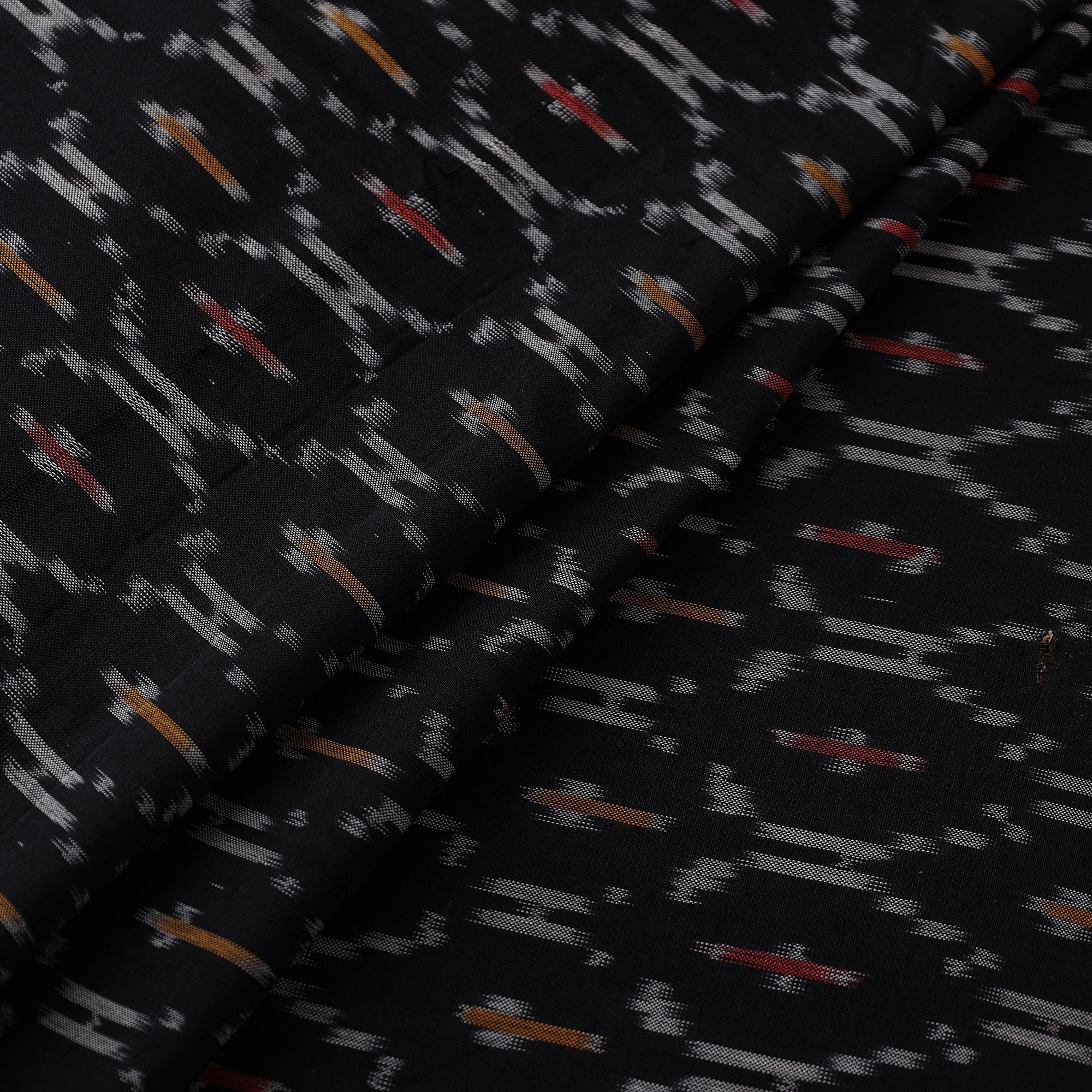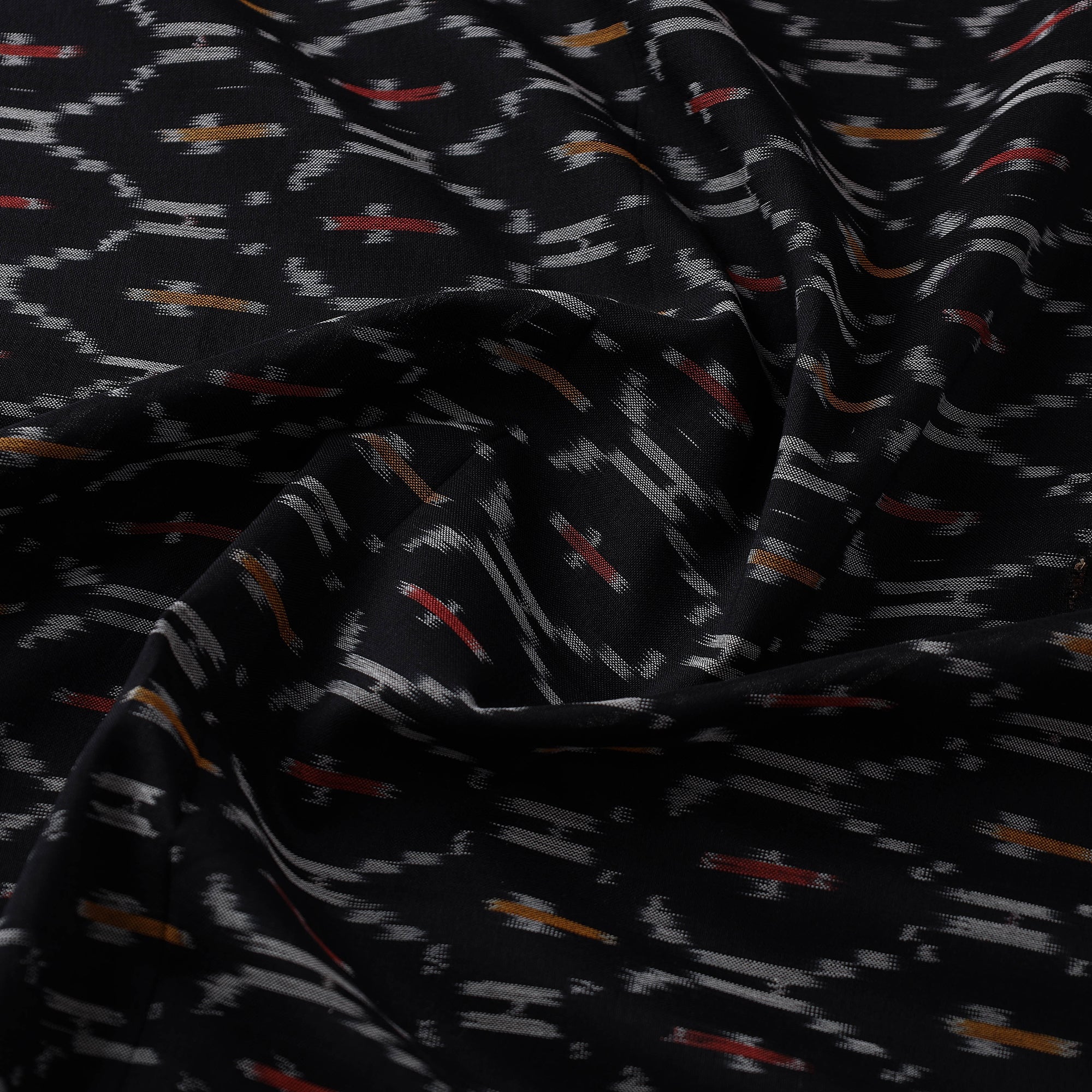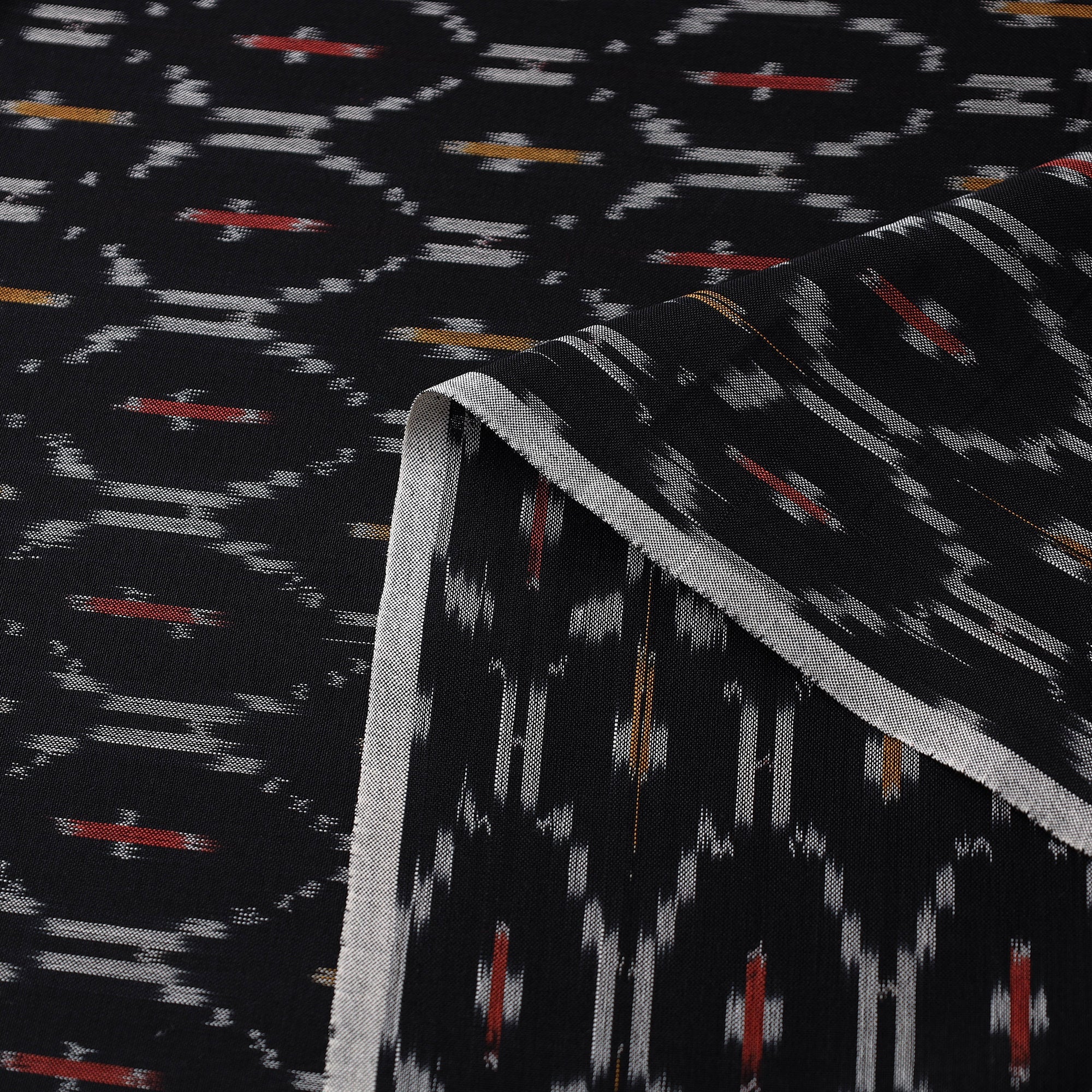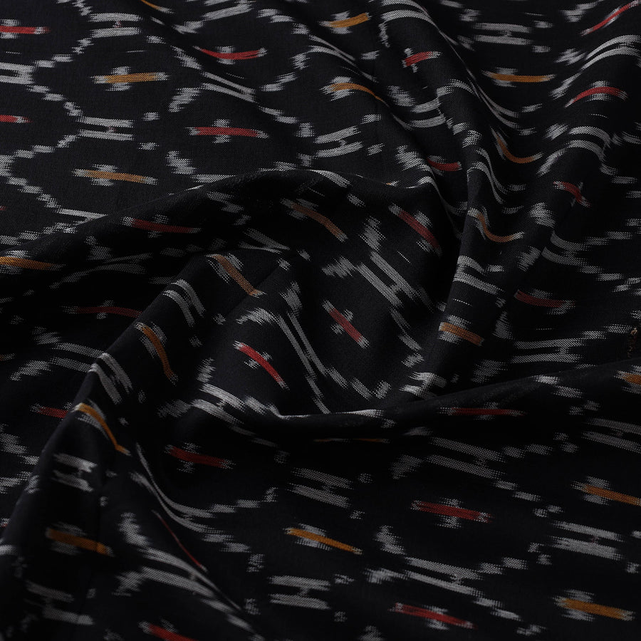 Black mercerised cotton pochampally ikat fabric from Telangana. This fabric features the distinctive Ikat dyeing technique, offering vibrant patterns and rich textures. Perfect for both traditional and modern projects, it’s a testament to India’s artisanal heritage.