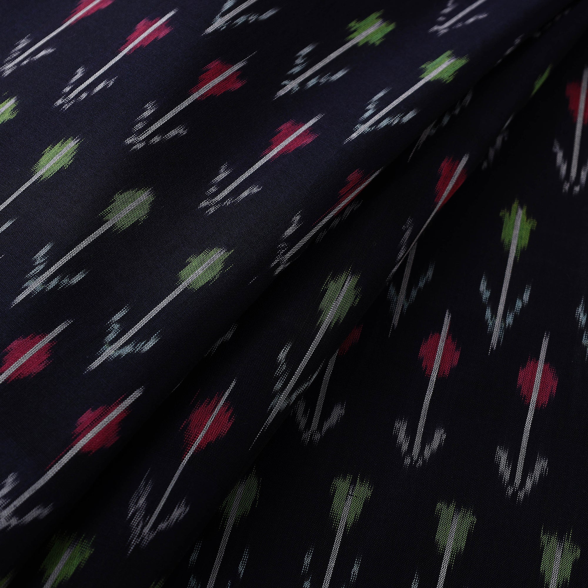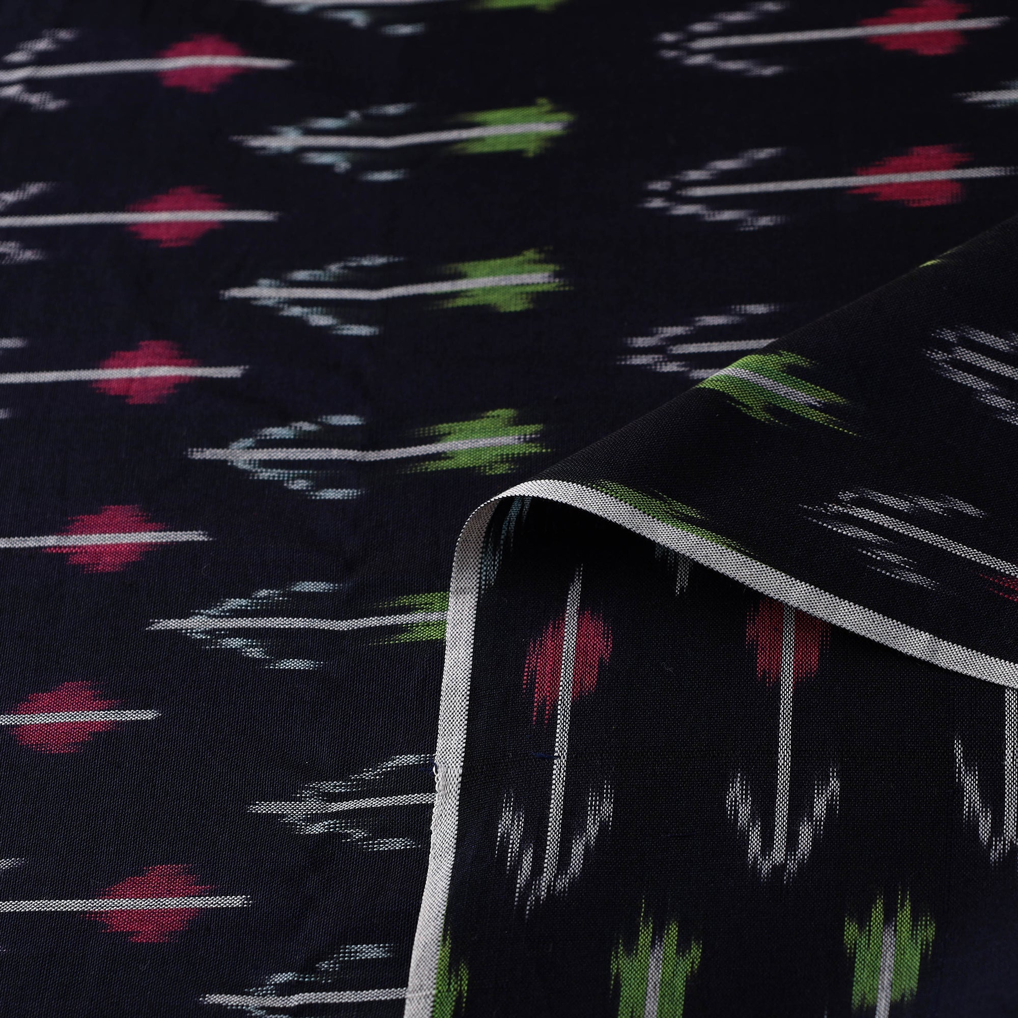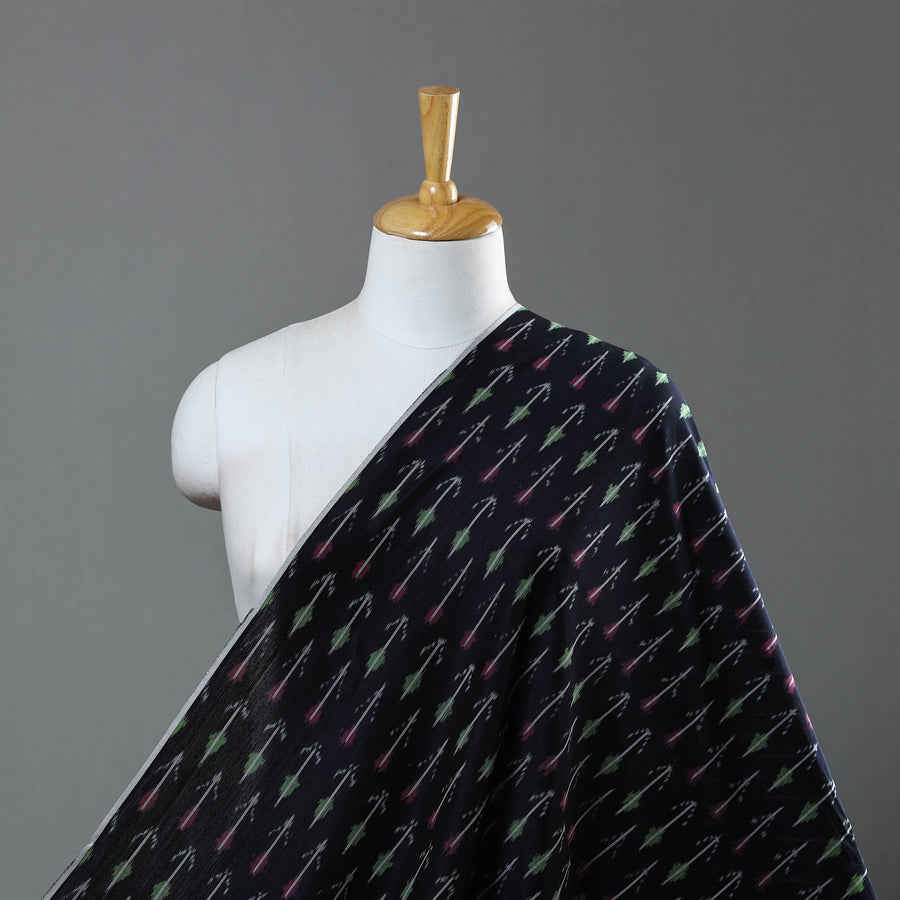 Black mercerised cotton pochampally ikat fabric from Telangana. This fabric features the distinctive Ikat dyeing technique, offering vibrant patterns and rich textures. Perfect for both traditional and modern projects, it’s a testament to India’s artisanal heritage.