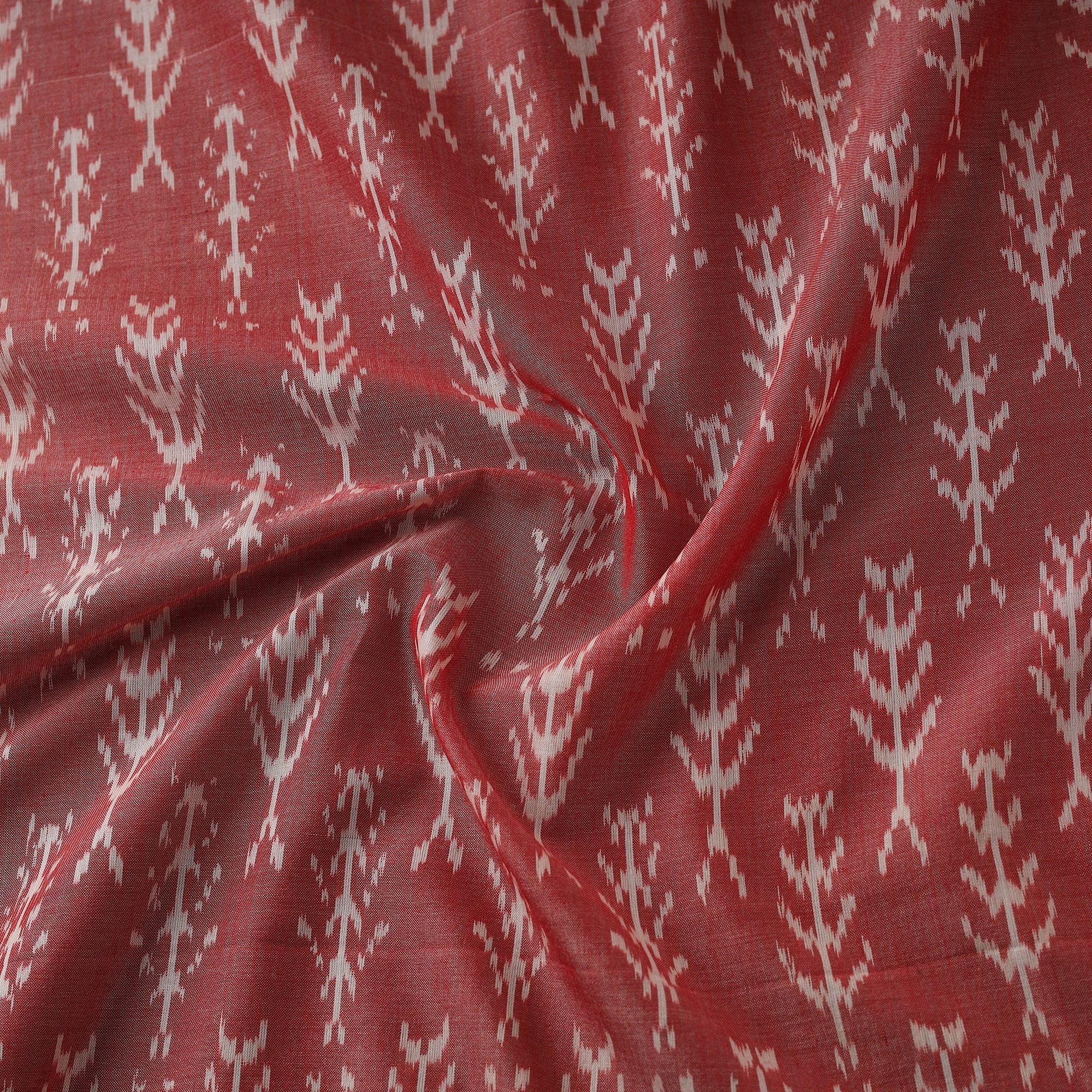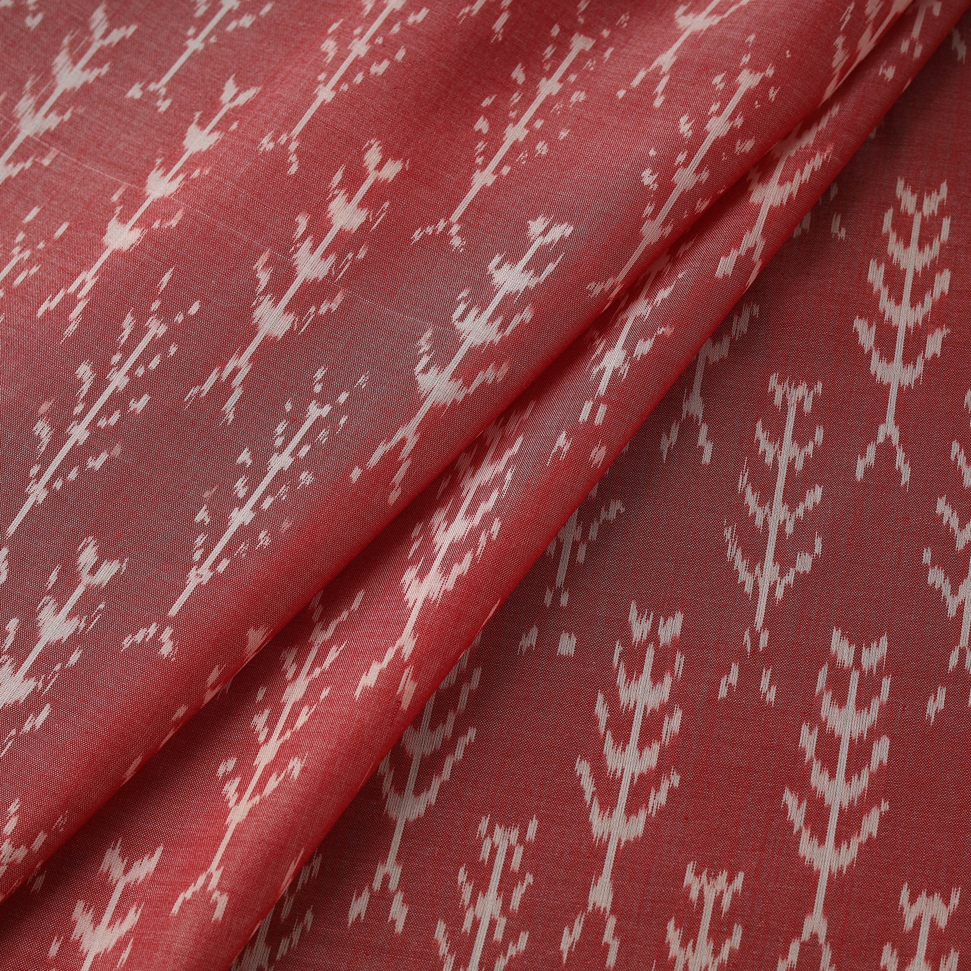 Pochampally ikat mercerised cotton fabric from Telangana, woven by skilled artisans. Ikat fabrics come from a small town called Pochampally close to Telangana. It is a handloom hub surrounded by lush verdant green hills. Ikat is an ancient technique that creates patterns on yarn through the laborious process of resisting segments of the yarn through tying. These carefully calculated, tied yarns are then dyed to create patterns. The yarn may then be used in the warp or weft or both to create beautifully patterned, distinct woven textiles. A tie & dye technique thread by thread which when placed together in a mathematical precision begin to create motifs on the fabric.