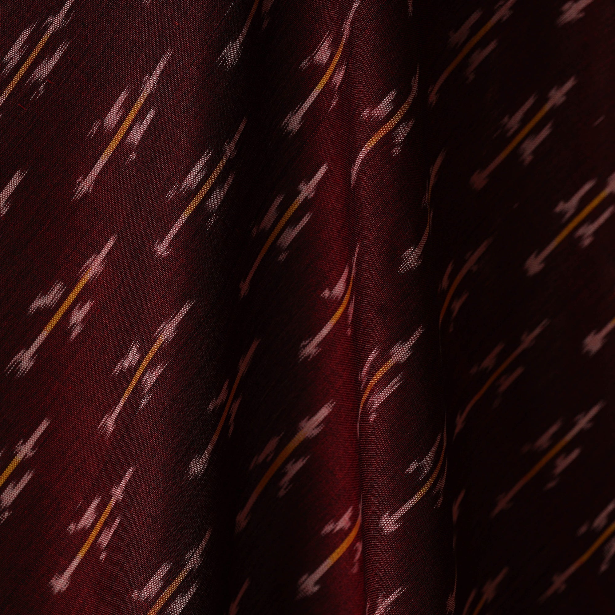 Explore maroon mercerised cotton pochampally ikat fabric from Telangana. This fabric is created using the traditional resist-dyeing technique, where threads are dyed before weaving to form striking patterns. Known for its vibrant colors and smooth texture, it beautifully blends tradition with modern style. Perfect for making sarees, kurtas, home decor and creative fashion projects.