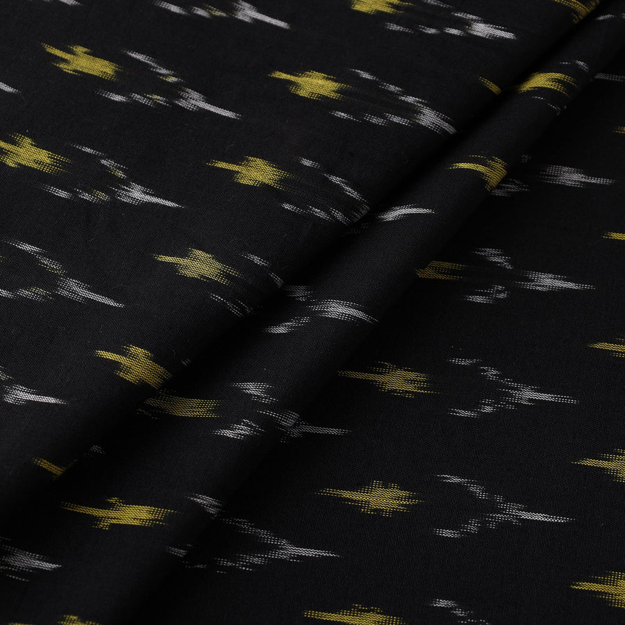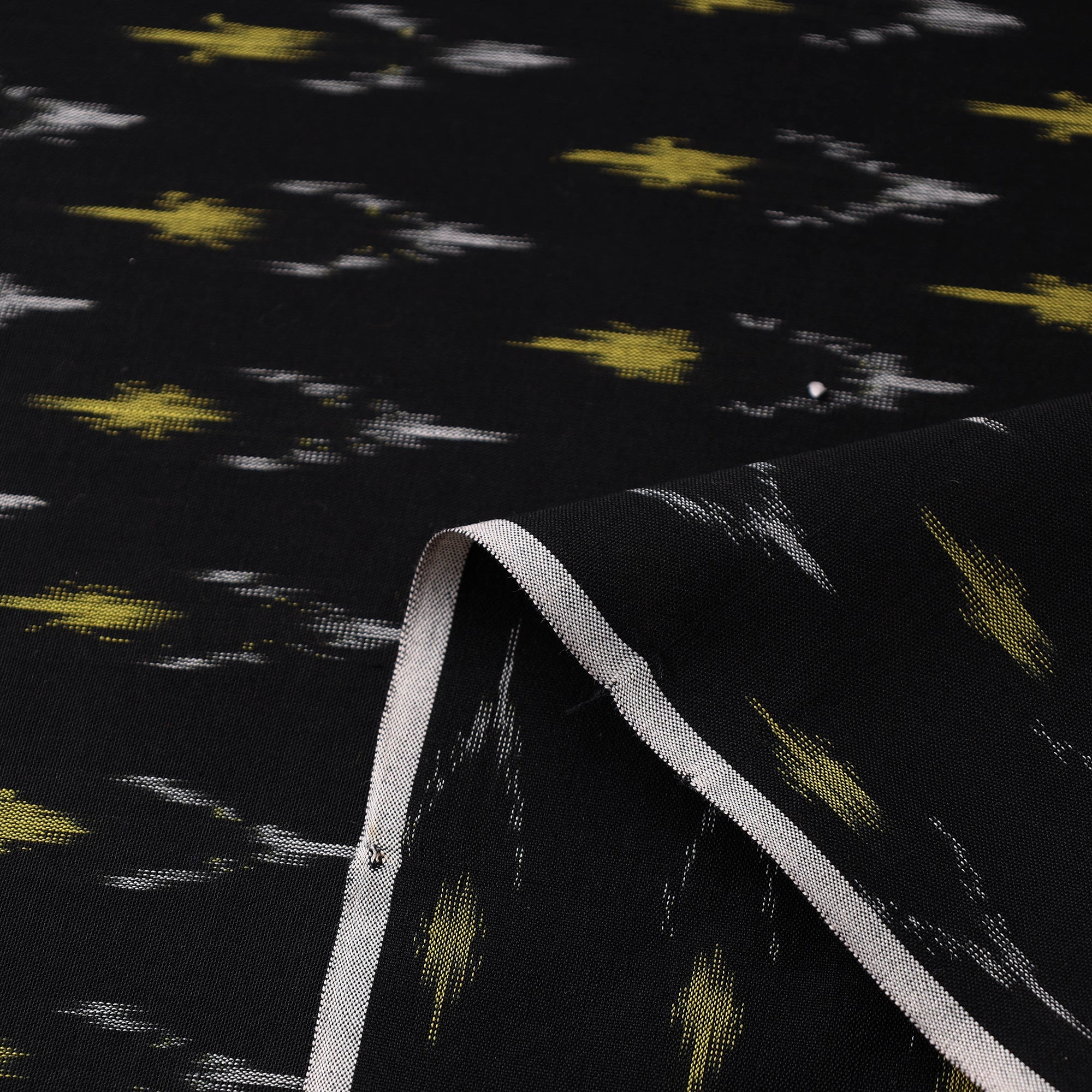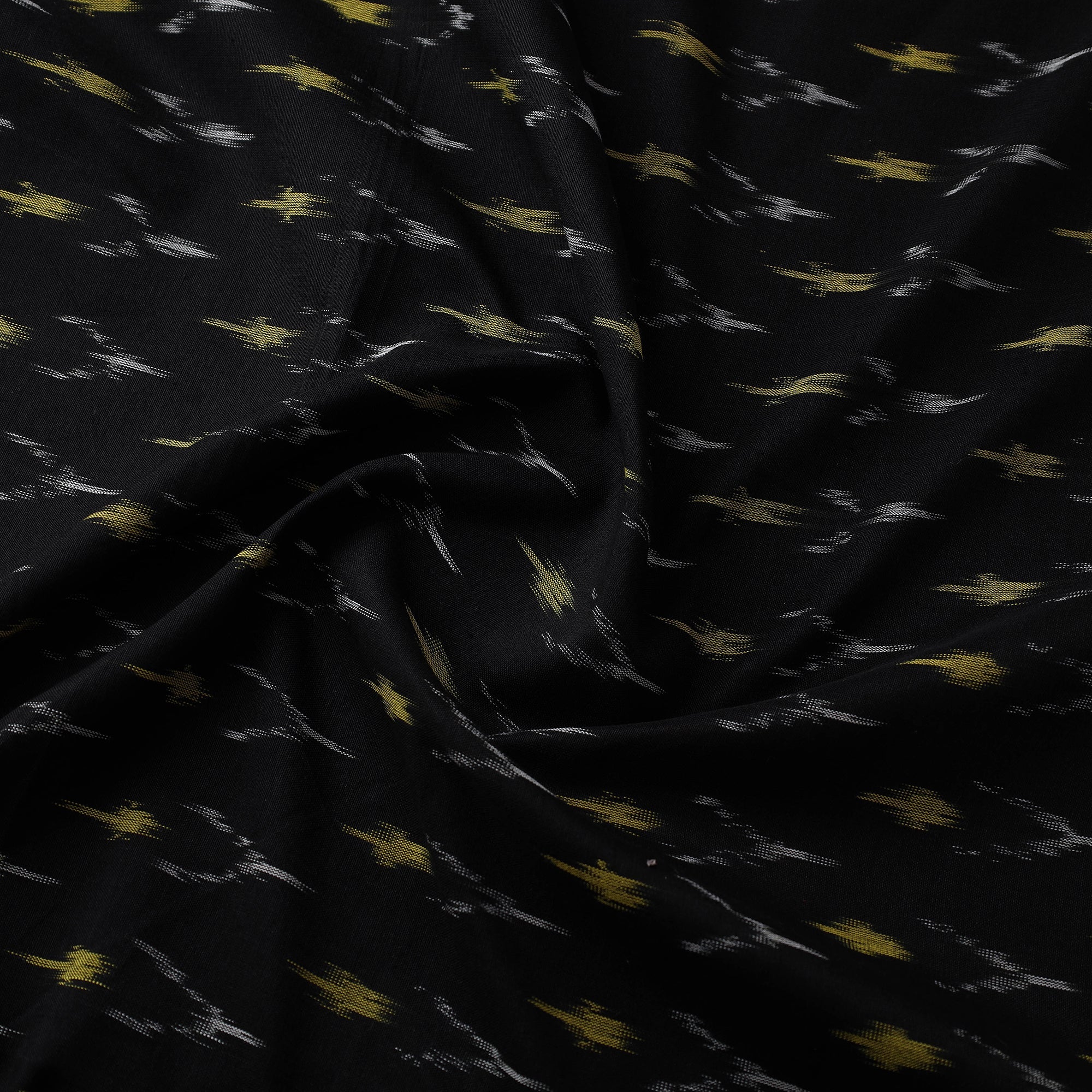Black mercerised cotton pochampally ikat fabric from Telangana. This fabric features the distinctive Ikat dyeing technique, offering vibrant patterns and rich textures. Perfect for both traditional and modern projects, it’s a testament to India’s artisanal heritage.