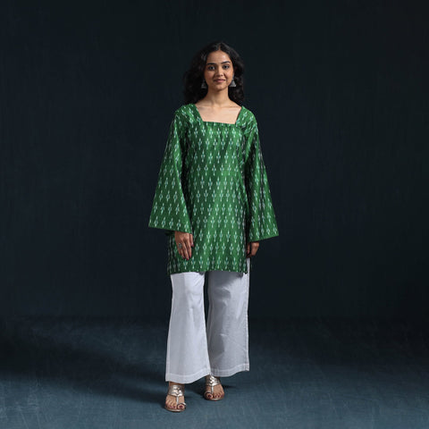 Pochampally ikat weave short kurta is made using the centuries-old Ikat resist-dye technique, where both warp and weft yarns are carefully dyed before weaving to create its distinctive patterns. Crafted in mercerised cotton, this kurta feels comfortable for all-day wear and offers a relaxed, easy fit. Suitable for office wear, casual outings and weekend plans.