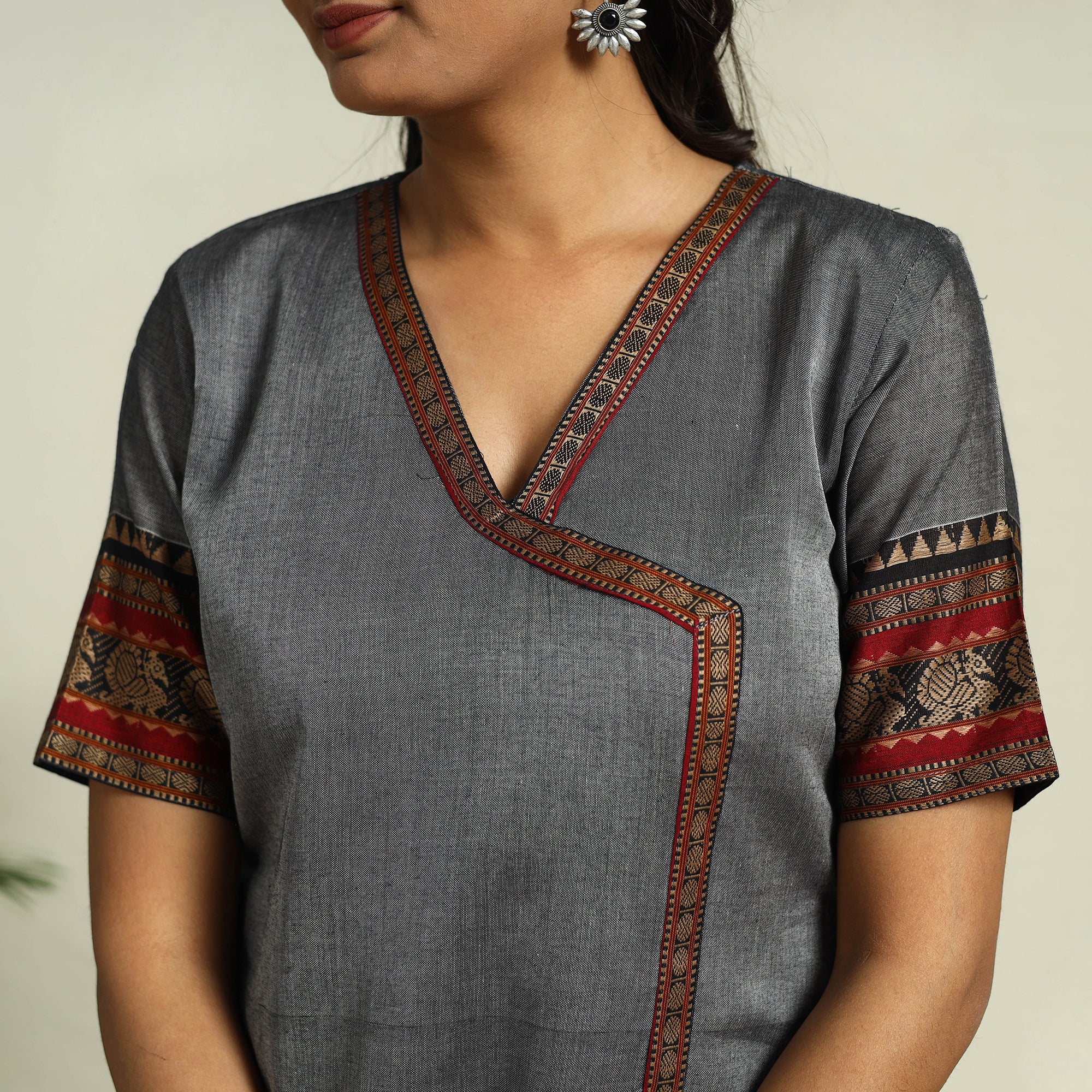 This straight grey dharwad kurta reflects the rich textile heritage of Karnataka’s Dharwad region. With woven border detailing and a side pocket, it blends comfort with tradition. Crafted from mercerized cotton, it offers a light sheen and breathable feel, making it perfect for casual wear or light festive occasions.