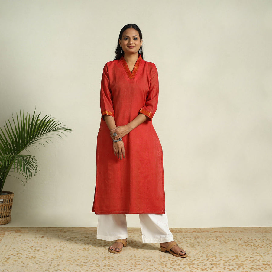 This red straight dharwad kurta reflects the rich textile heritage of Karnataka’s Dharwad region. With woven border detailing and a side pocket, it blends comfort with tradition. Crafted from mercerized cotton, it offers a light sheen and breathable feel, making it perfect for casual wear or light festive occasions.