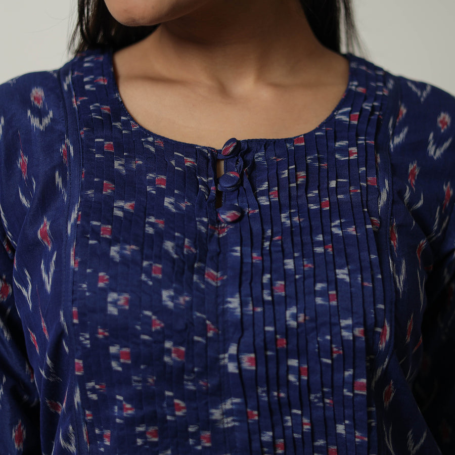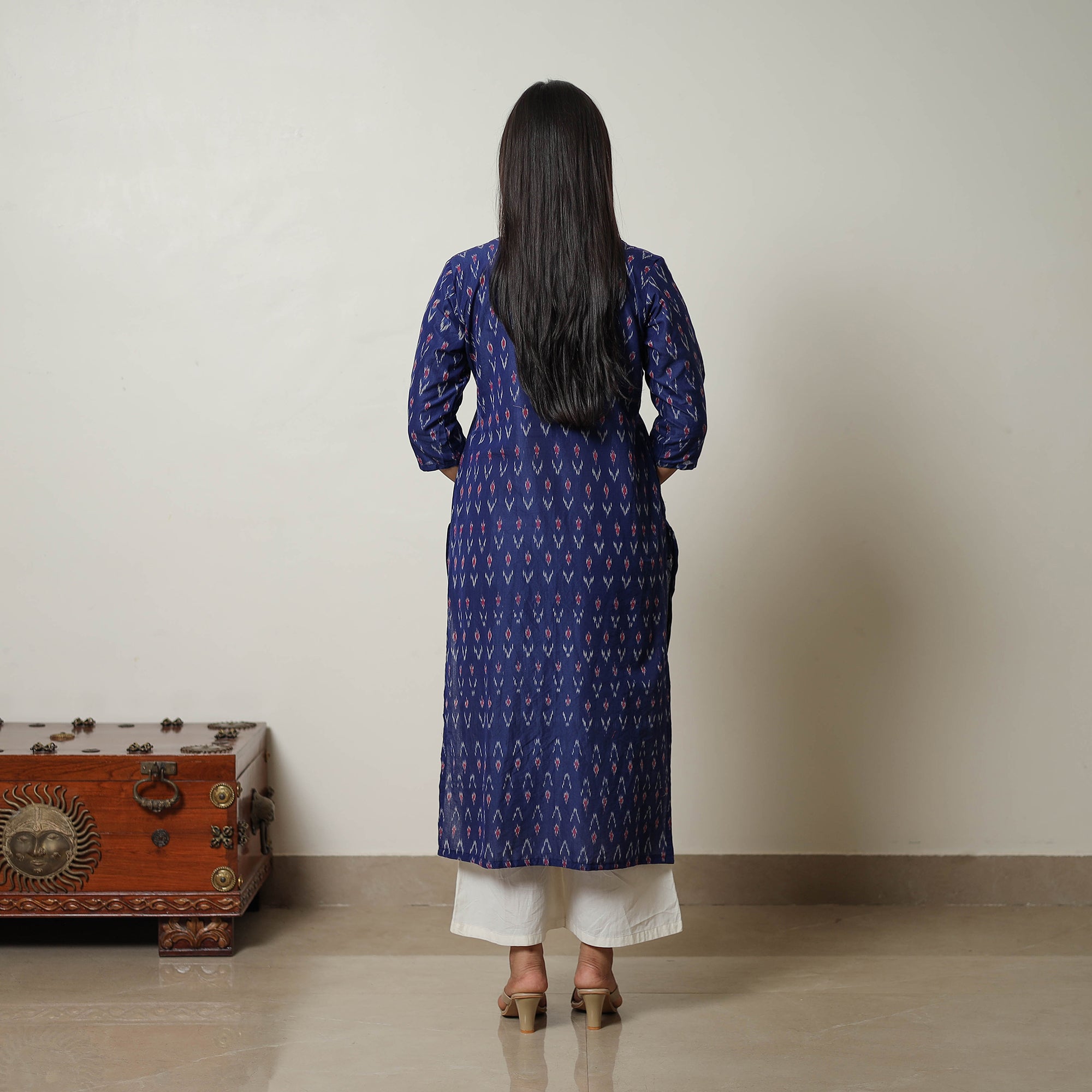 Embrace tradition with our blue mercerised cotton a-line pochampally ikat kurta. Handwoven with care, it showcases the vibrant, timeless beauty of Pochampally's ikat weaving. With a comfortable fit and handy side pocket, this kurta ensures style and ease for your everyday wear.