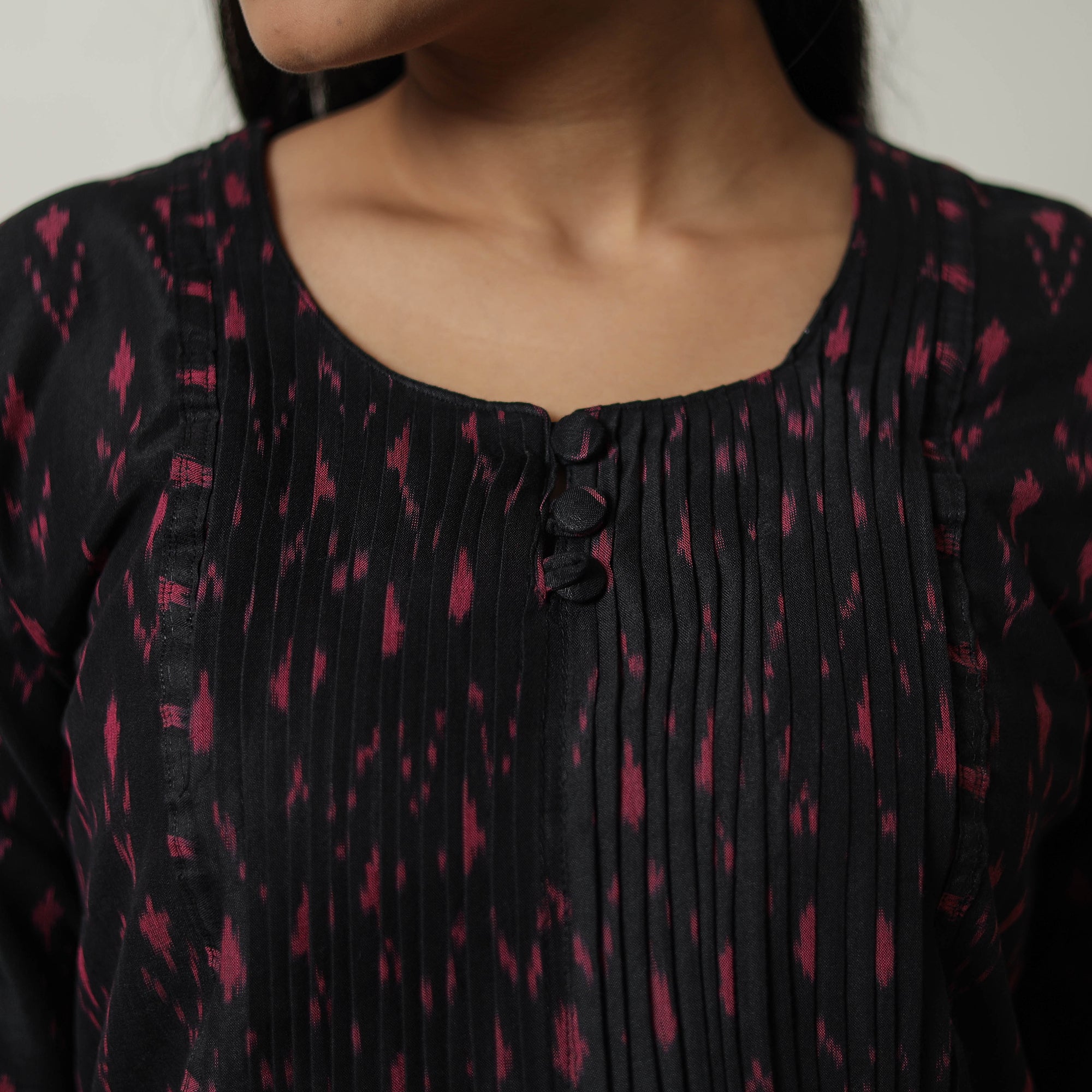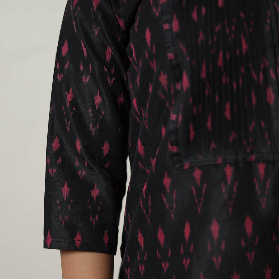 Embrace tradition with our black mercerised cotton a-line pochampally ikat kurta. Handwoven with care, it showcases the vibrant, timeless beauty of Pochampally's ikat weaving. With a comfortable fit and handy side pocket, this kurta ensures style and ease for your everyday wear.