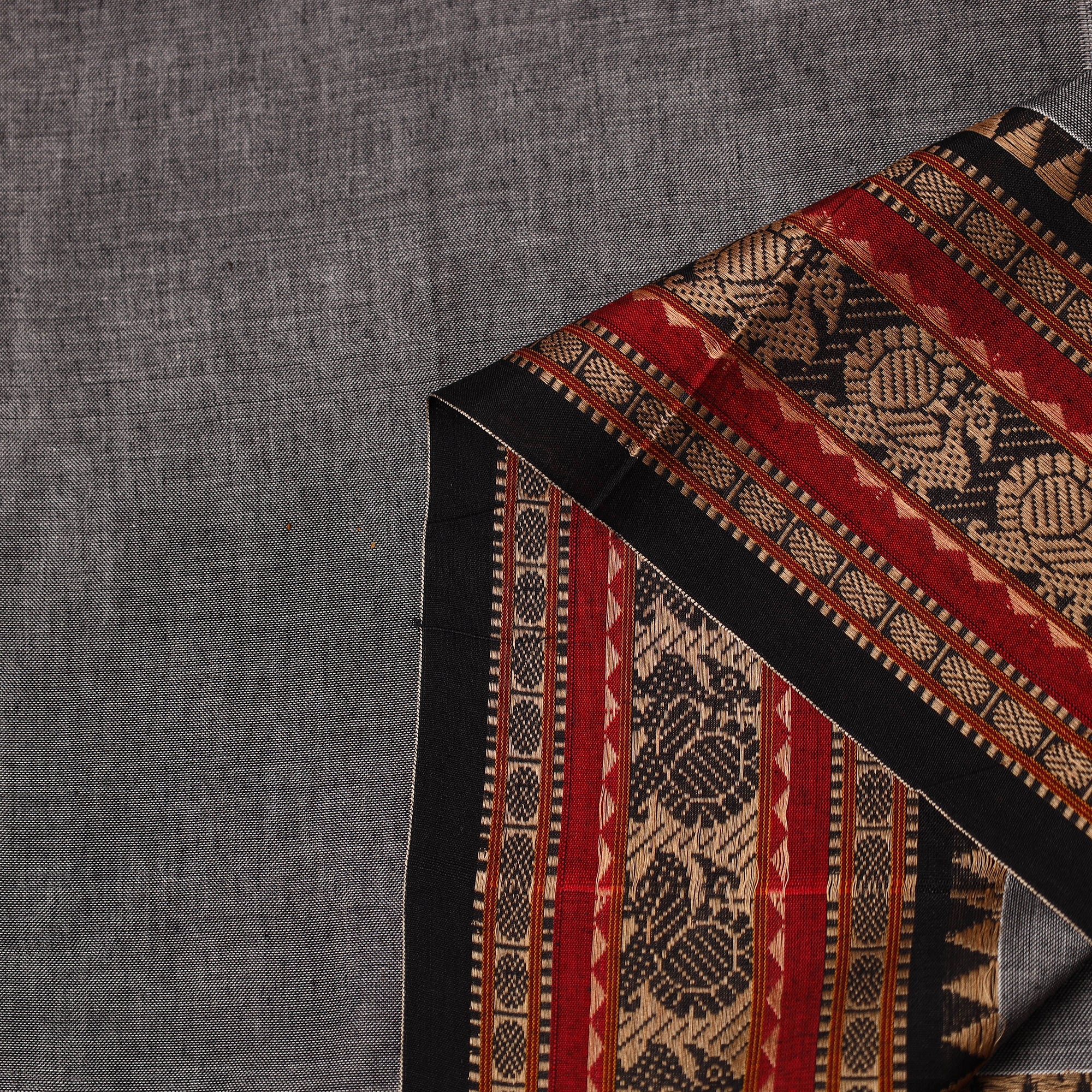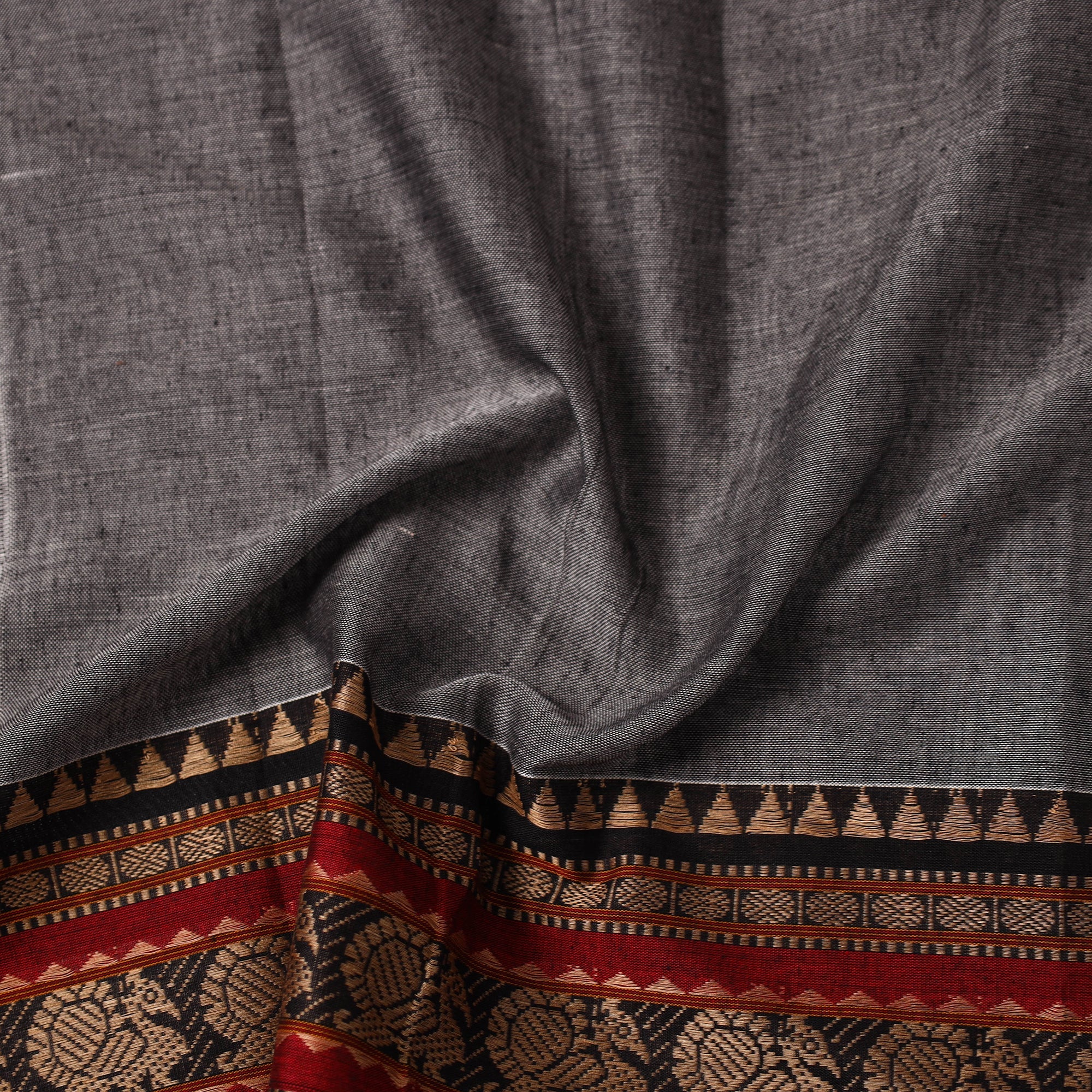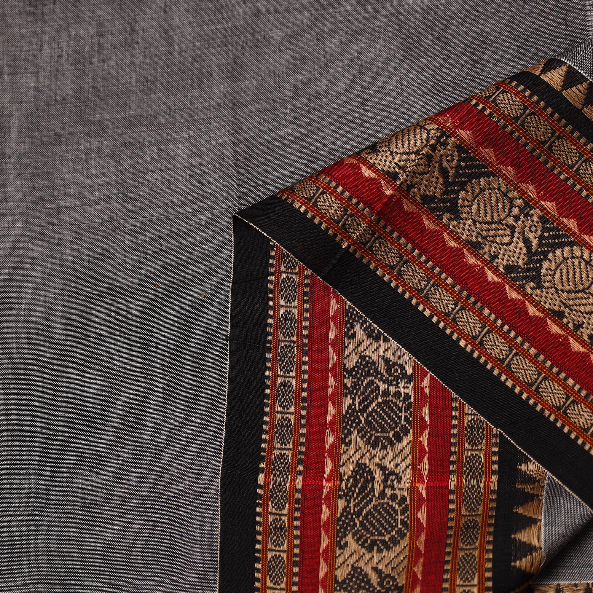Grey dharwad fabric is crafted from mercerised cotton and finished with a traditional thread border. This fabric is machine-woven in Karnataka. Lightweight, durable, and versatile perfect for fashion or home decor accents.