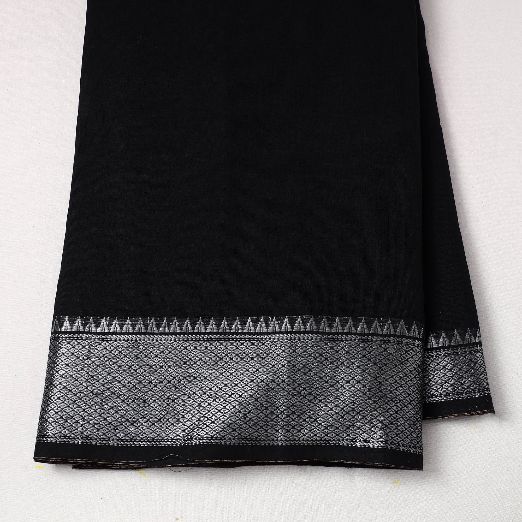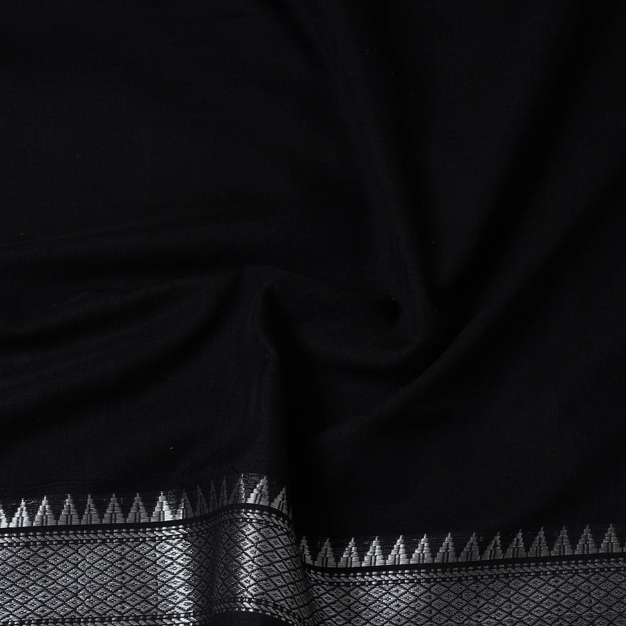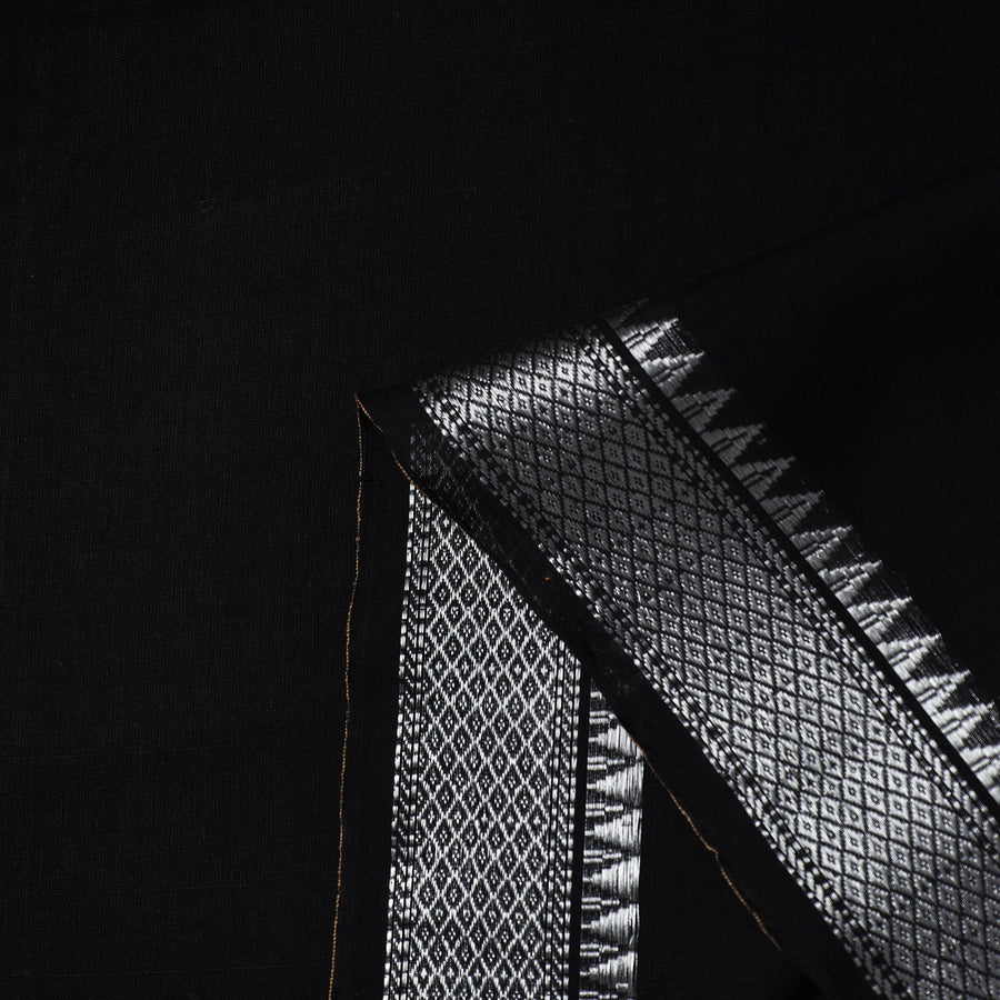 This prewashed black mercerised cotton zari border dharwad fabric. Perfect for crafting stylish outfits, home decor, or creative projects, it combines durability with elegance, this dharwad fabric from Karnataka brings functionality and a touch of tradition to your creations.