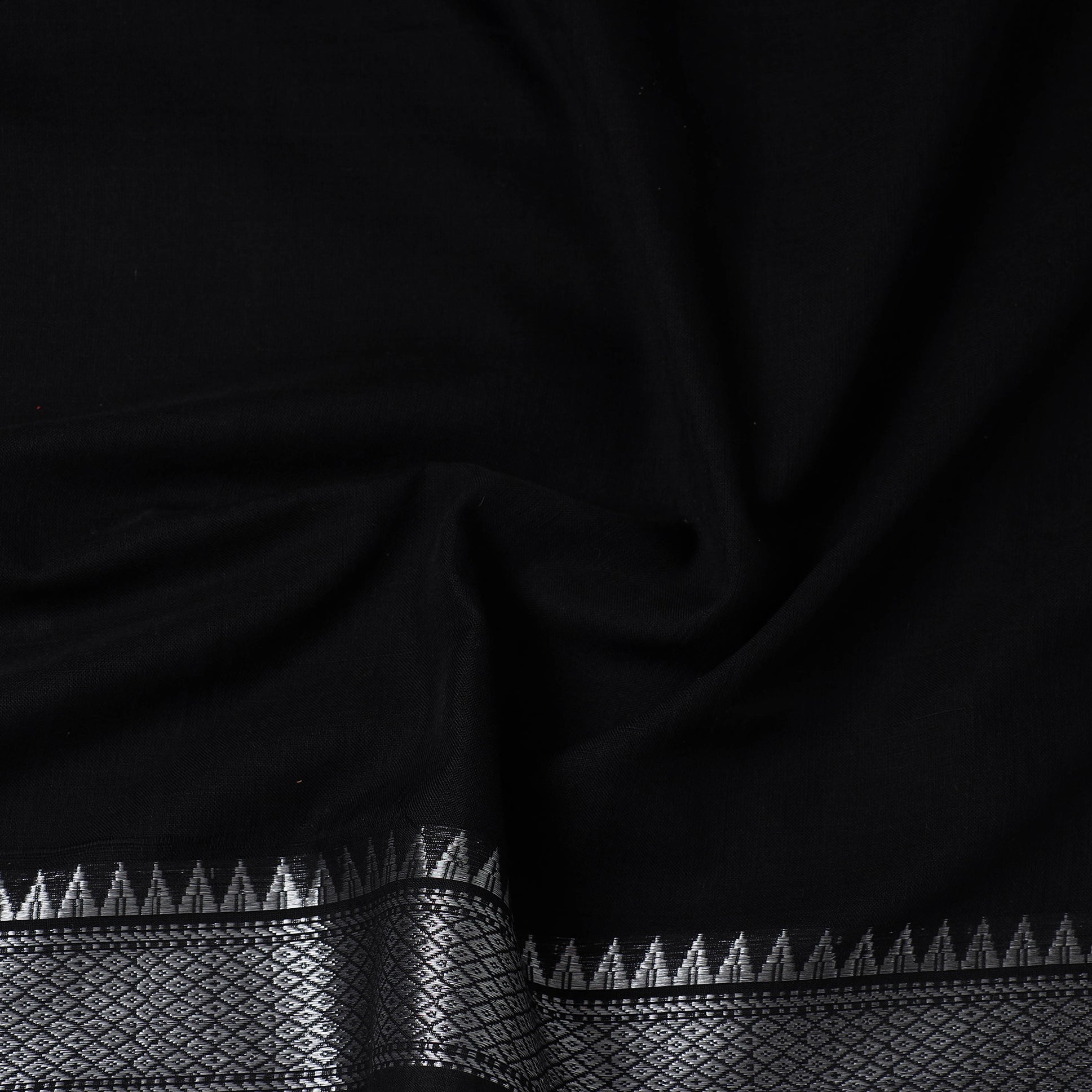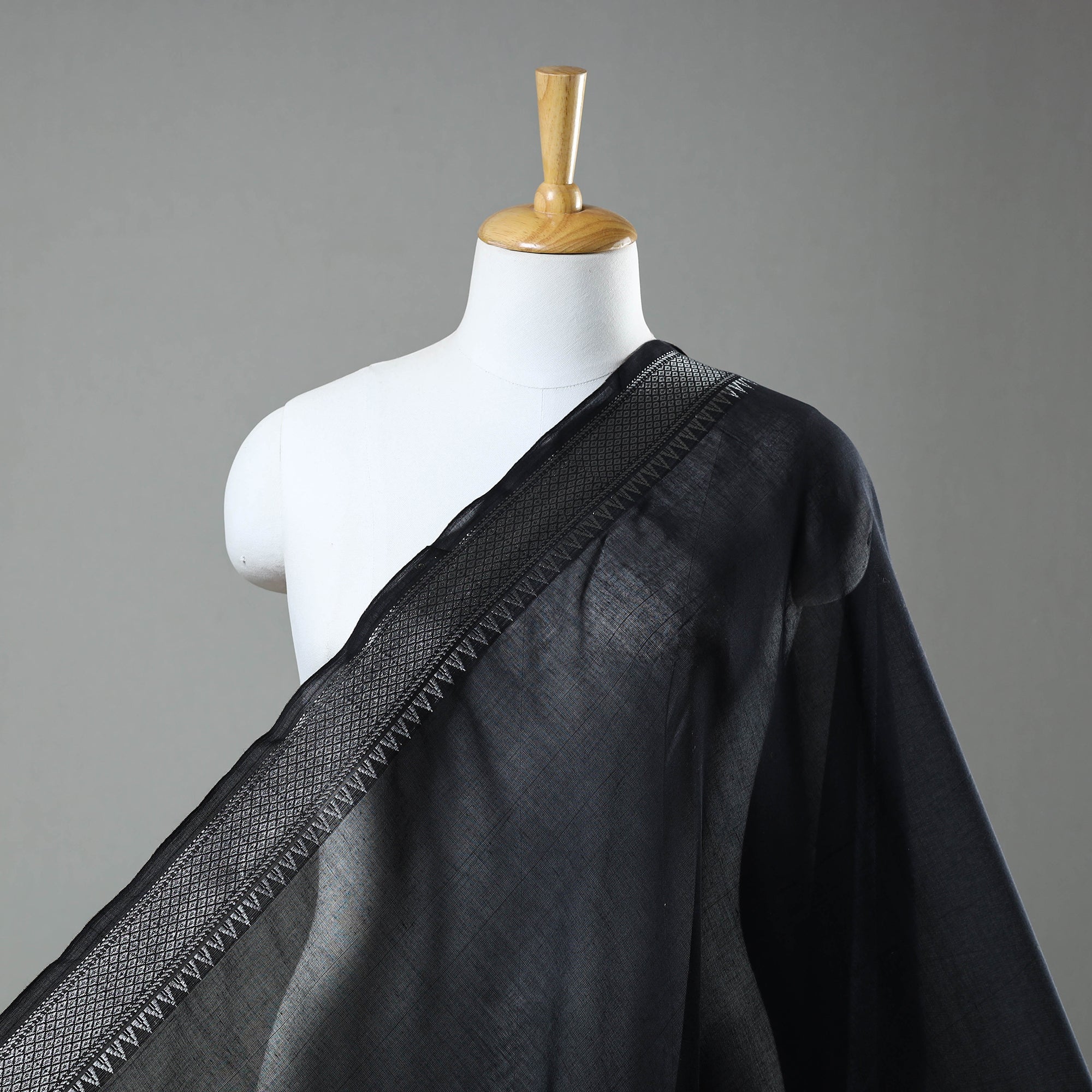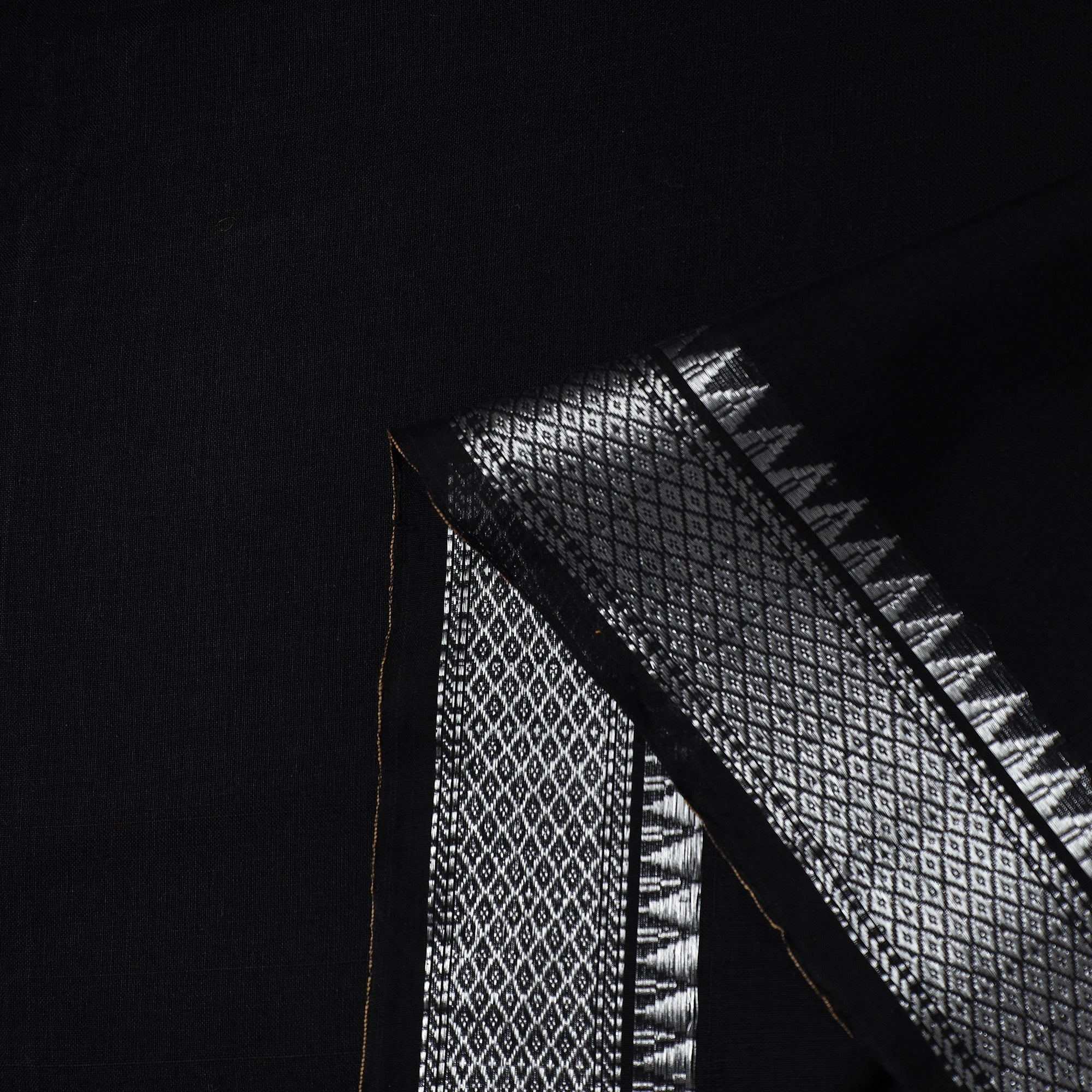 This prewashed black mercerised cotton zari border dharwad fabric. Perfect for crafting stylish outfits, home decor, or creative projects, it combines durability with elegance, this dharwad fabric from Karnataka brings functionality and a touch of tradition to your creations.