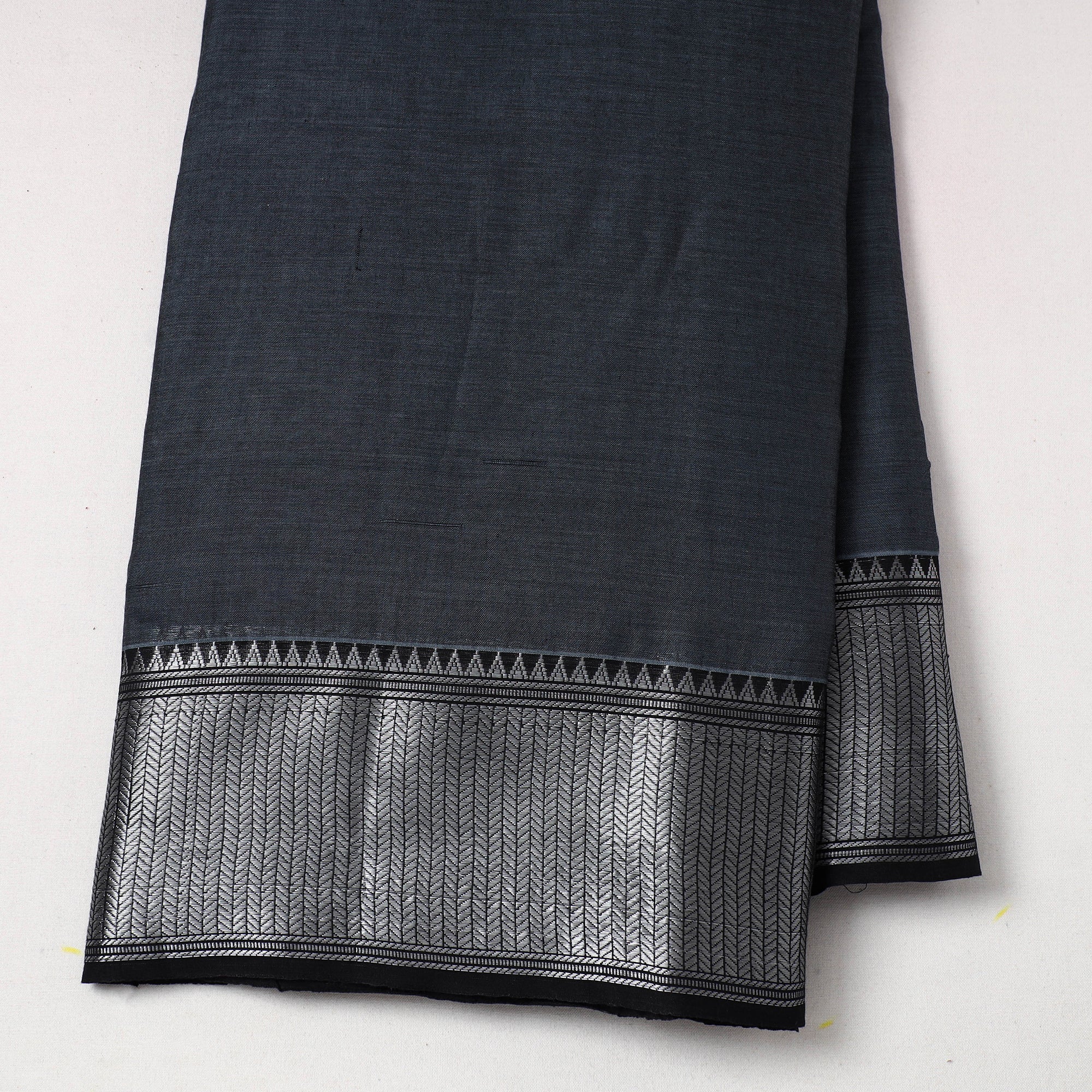 This prewashed grey mercerised cotton zari border dharwad fabric. Perfect for crafting stylish outfits, home decor, or creative projects, it combines durability with elegance, this dharwad fabric from Karnataka brings functionality and a touch of tradition to your creations.