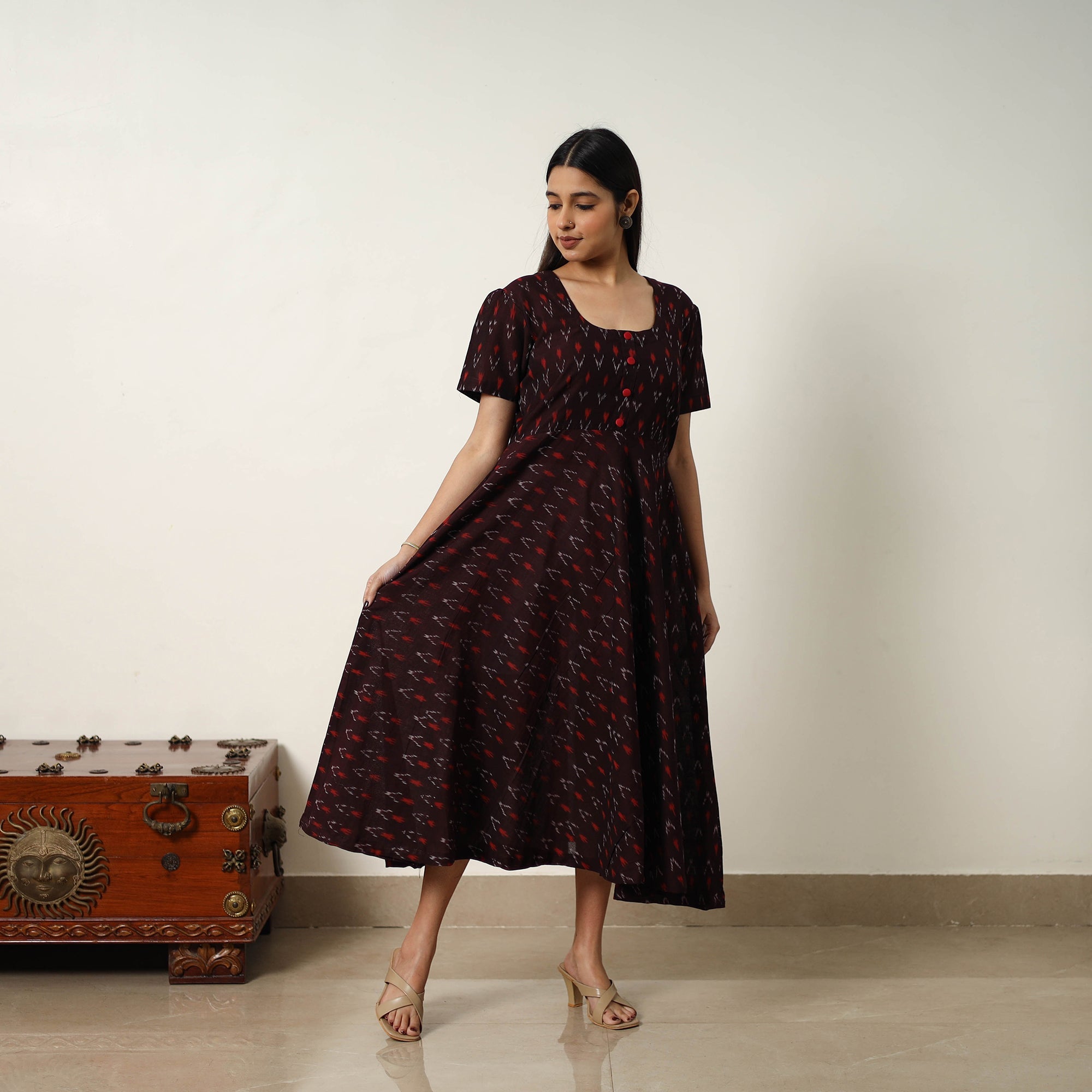 This uniquely designed mercerized cotton flared pochampally ikat dress is a perfect blend of style and comfort. Featuring a breathable and skin-friendly fabric, this dress offers unmatched comfort and timeless style. This dress is perfect for your daily outing and for a special occasion.