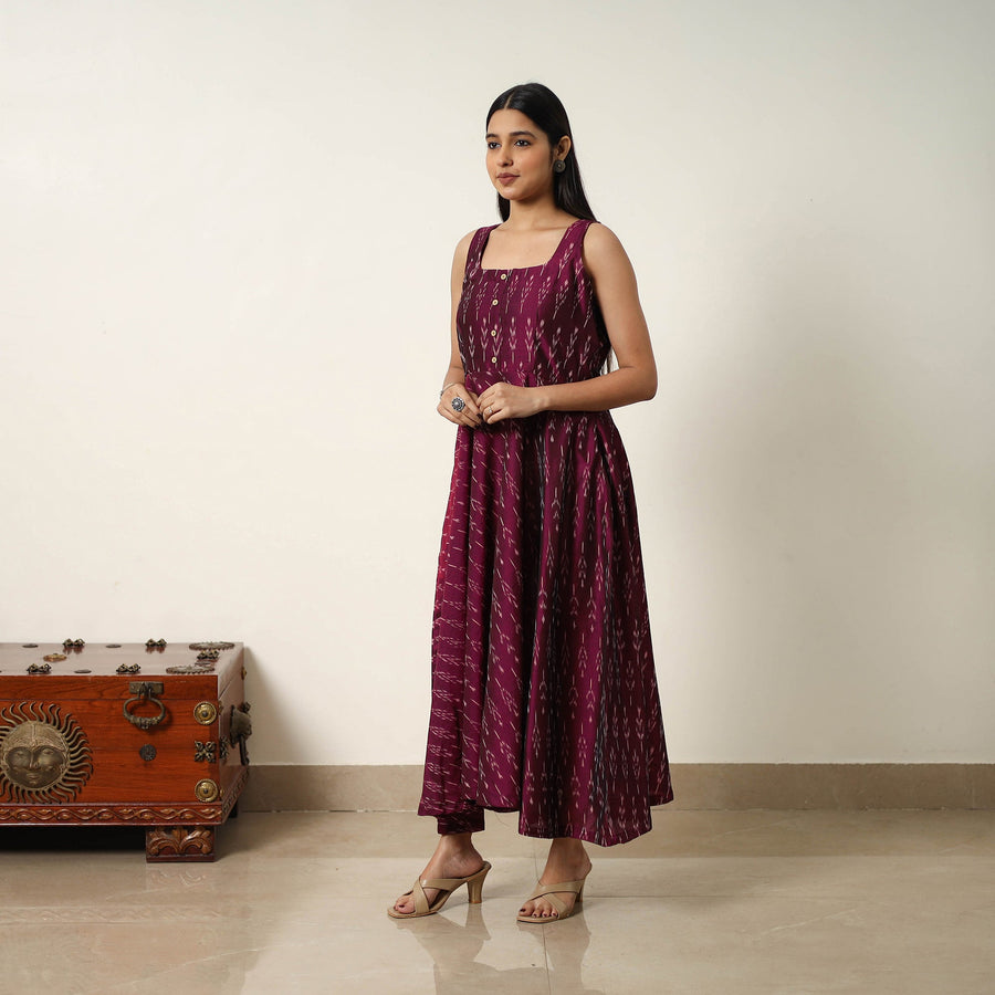 This uniquely designed mercerized cotton flared pochampally ikat dress is a perfect blend of style and comfort. Featuring a breathable and skin-friendly fabric, this dress offers unmatched comfort and timeless style. This dress is perfect for your daily outing and for a special occasion.