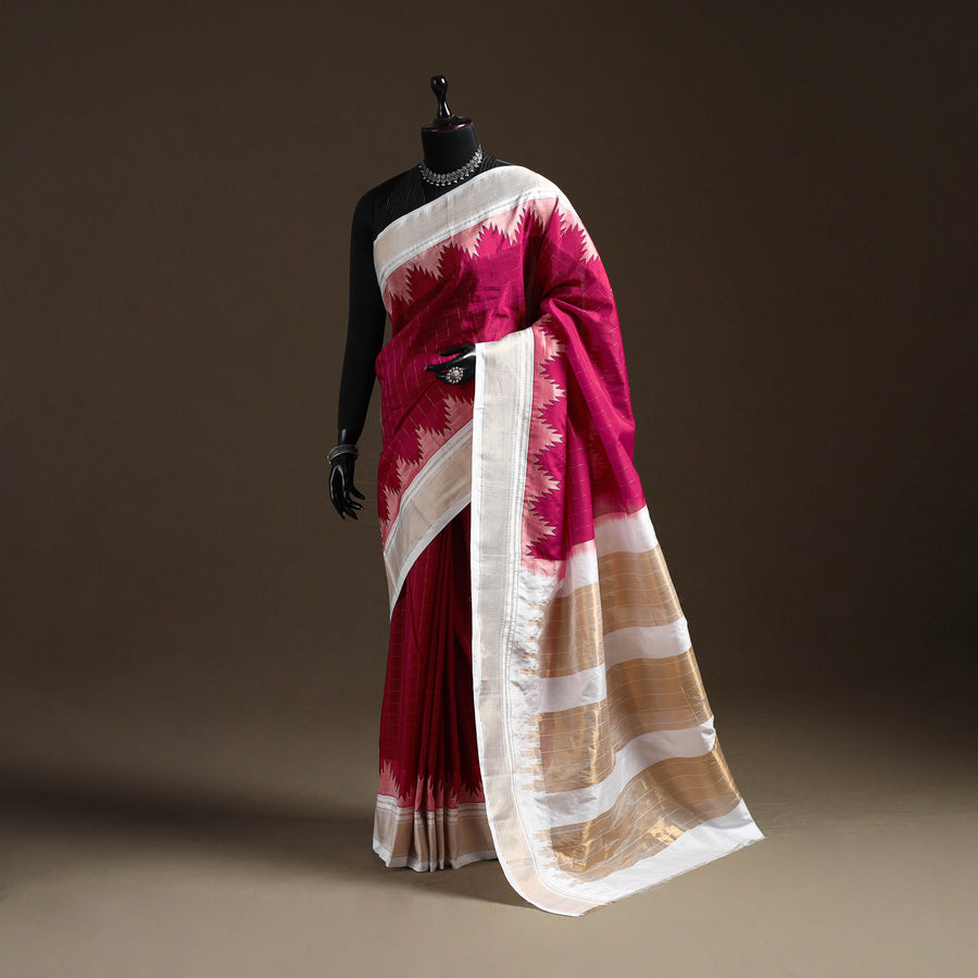 | Material | Gadwal checks ilkal saree featuring a temple zari border. Woven using the Ilkal technique, its mercerized cotton body beautifully contrasts with the catlon pallu, while fine zari detailing adds richness and depth to the drape. A matching blouse piece completes the look, making it ideal for weddings, festive occasions and cultural celebrations. |