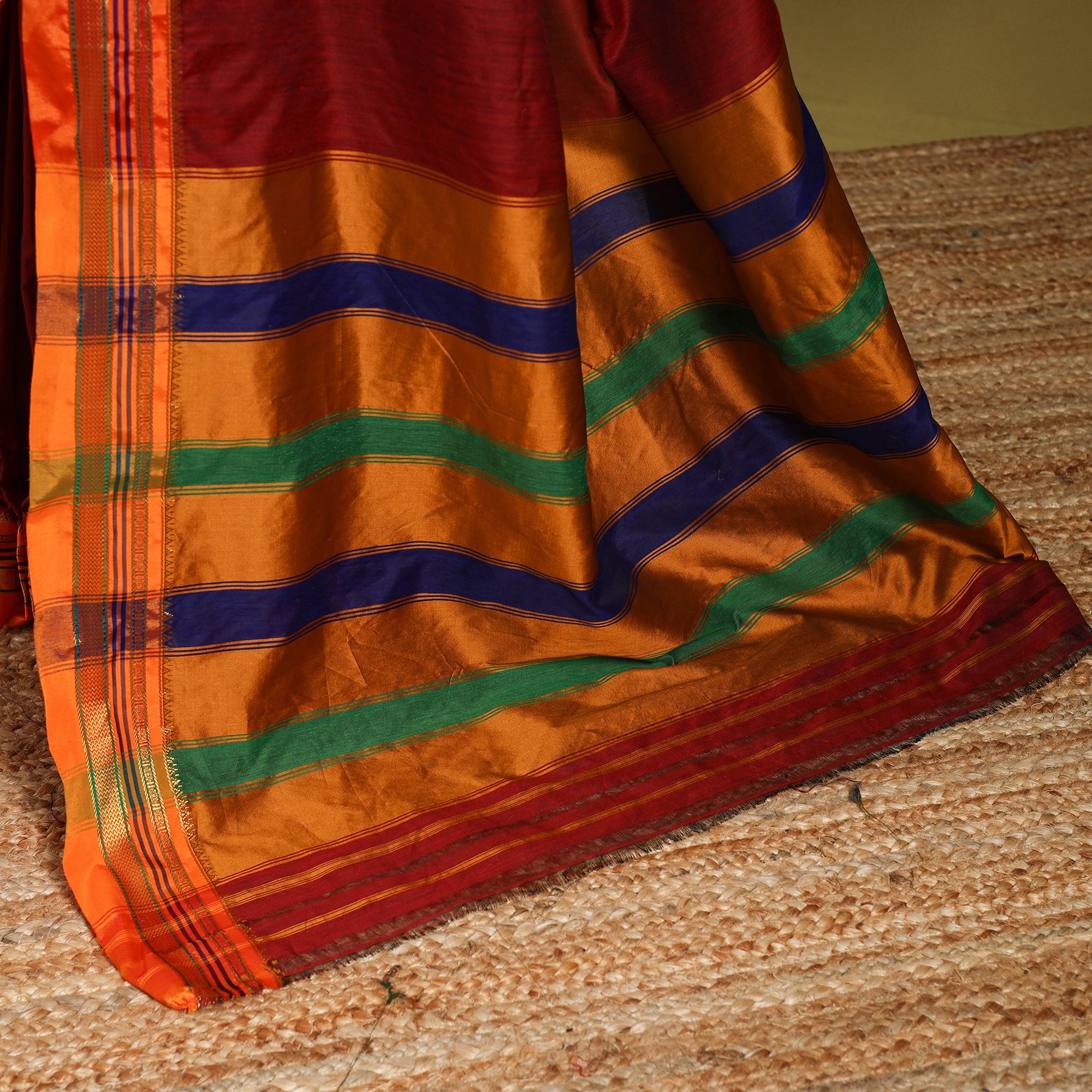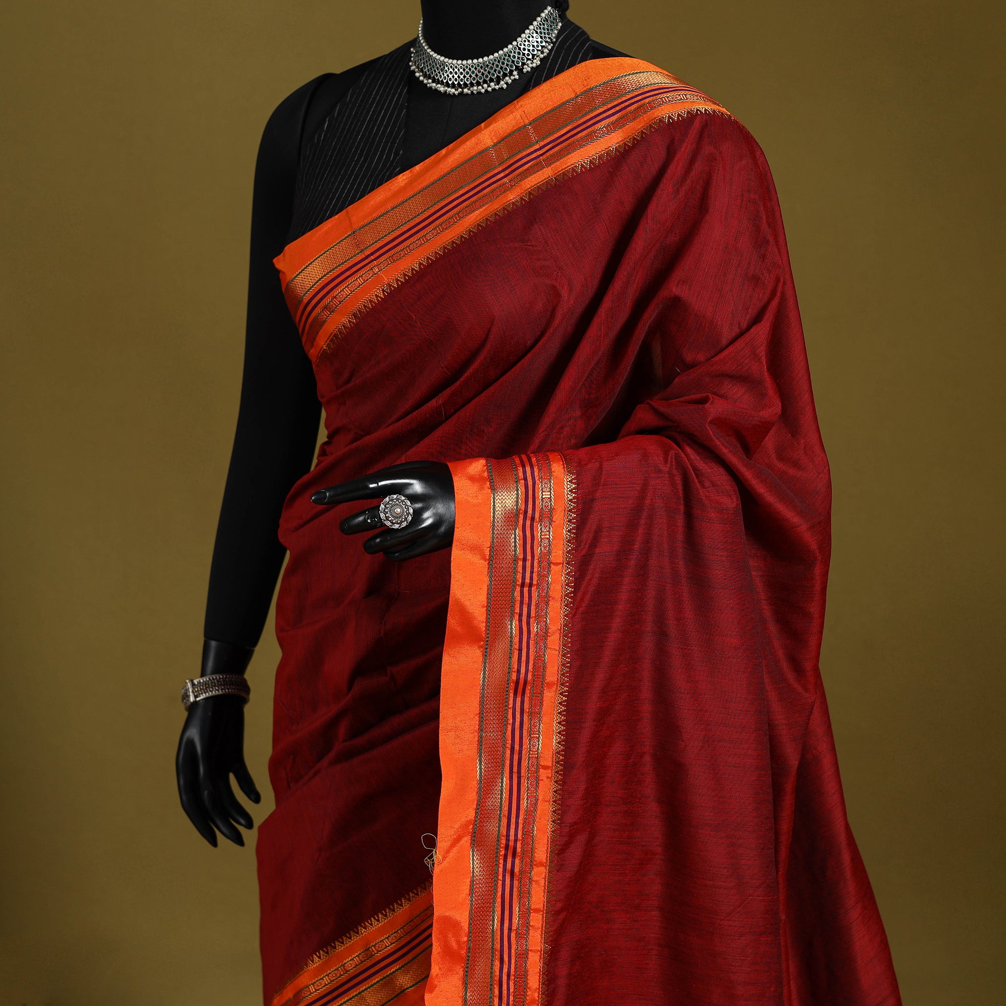 This maroon mercerized cotton Ilkal saree blends everyday comfort with elegant charm. Woven in the traditional Ilkal technique, it has a soft drape and a subtle sheen, making it ideal for both casual outings and festive occasions. The classic border enhances its beauty, while the rich weave reflects the heritage of Karnataka’s looms. It comes with a matching blouse piece to complete the graceful look.