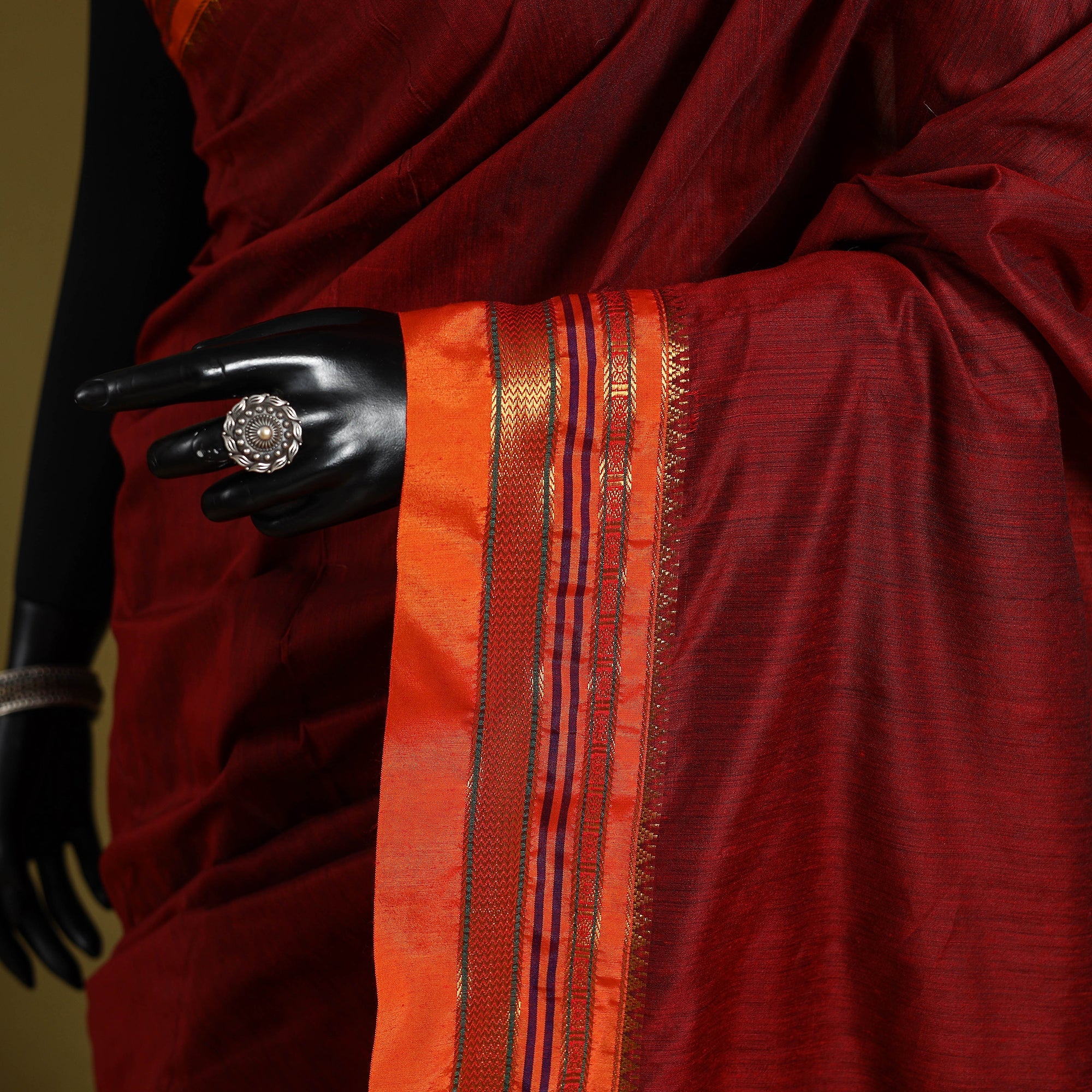 A real silk saree will have slight variations in texture uniformity, which are quite noticeable.