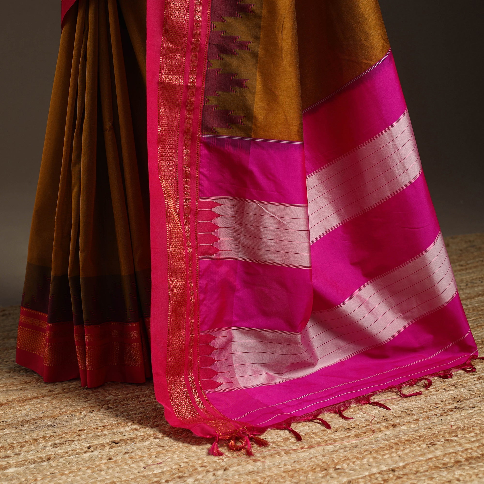 This brown ilkal saree, featuring a traditional chikki paras border is crafted by skilled weavers of Karnataka. Woven using the ilkal technique, its mercerized cotton body beautifully contrasts with the catlon pallu, adding depth and texture to the drape. This saree is an elegant choice for festive celebrations, cultural gatherings or graceful everyday wear.