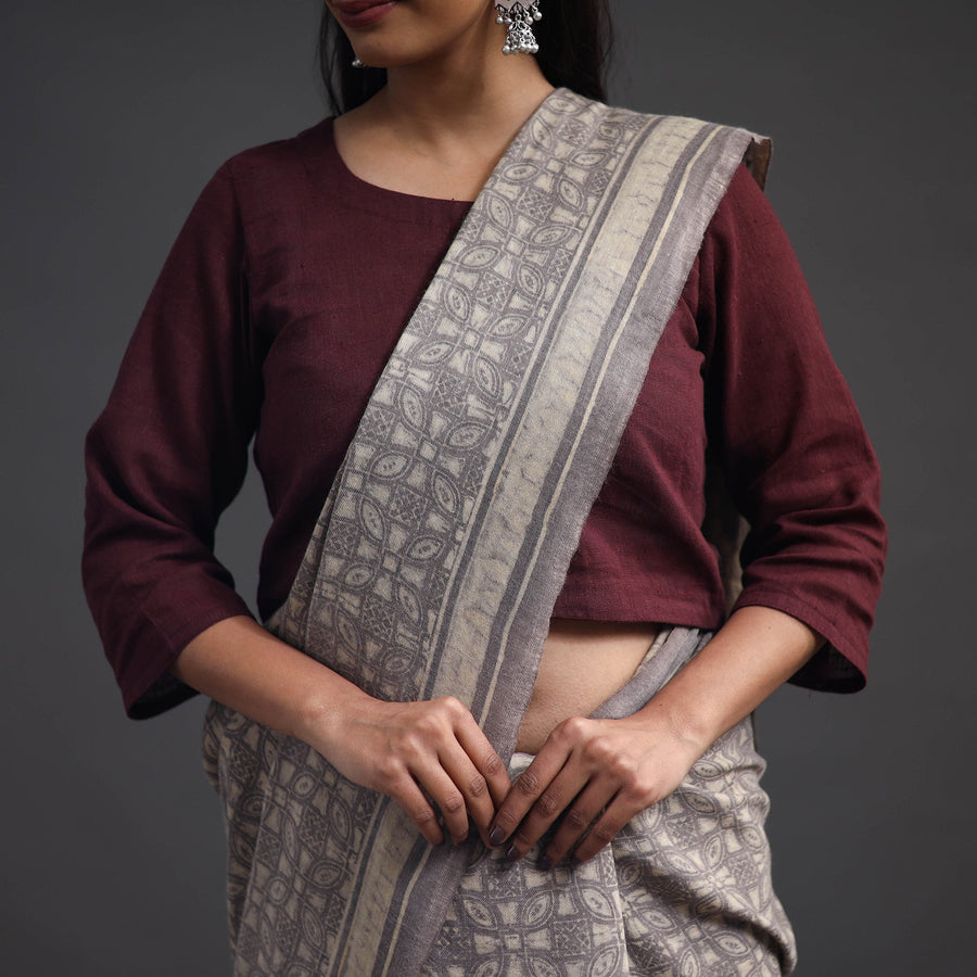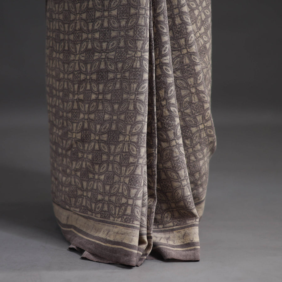 Experience elegance with this grey merino wool block print ajrakh saree with tassels, showcasing intricate block prints by master artisan Jabbar Khatri in the Kutch region of Gujarat. Crafted with natural dyes and traditional techniques, it blends vibrant colors with lightweight and warm soft, breathable wool for all-day comfort. Perfect for chilly evenings, festive occasions,or elegant gatherings.