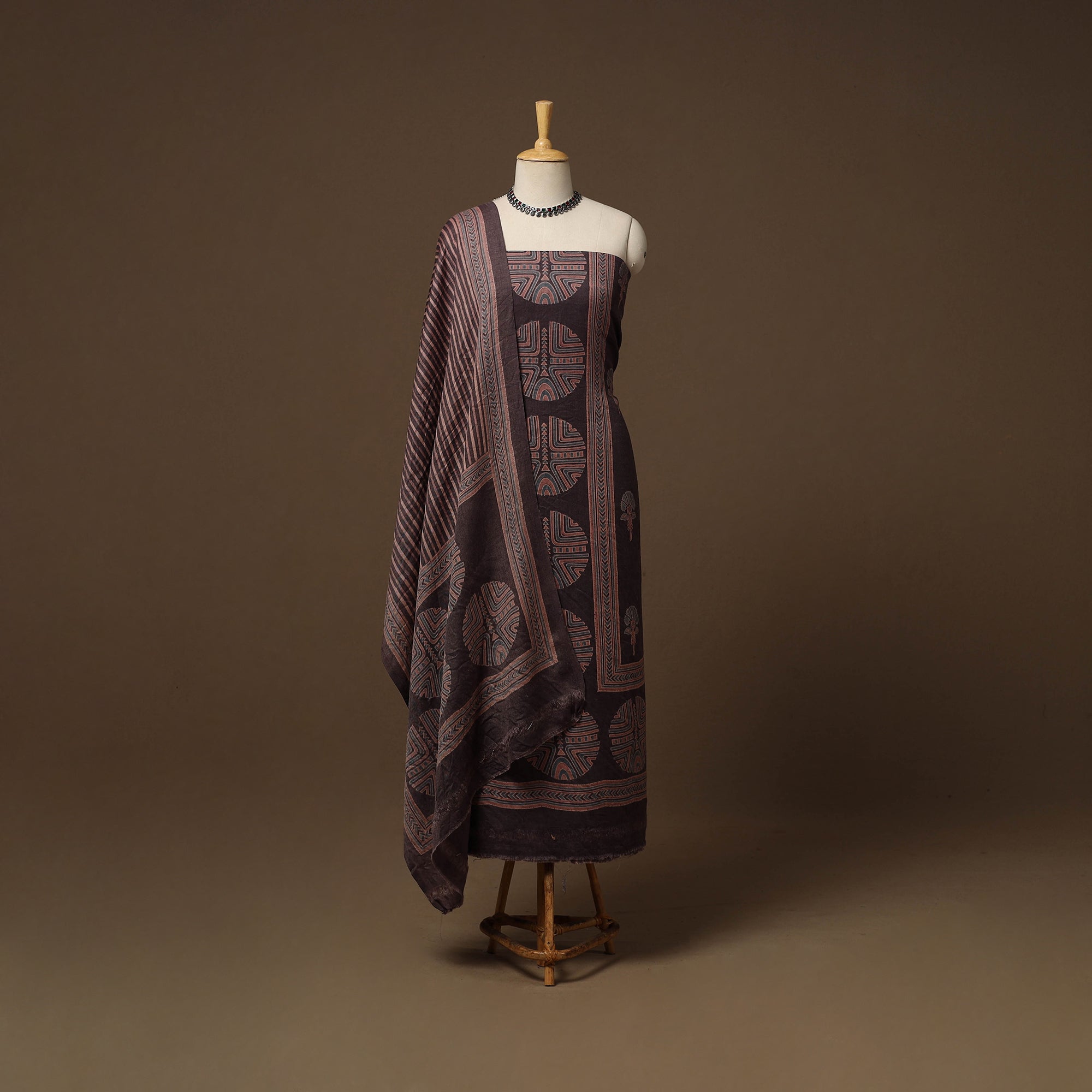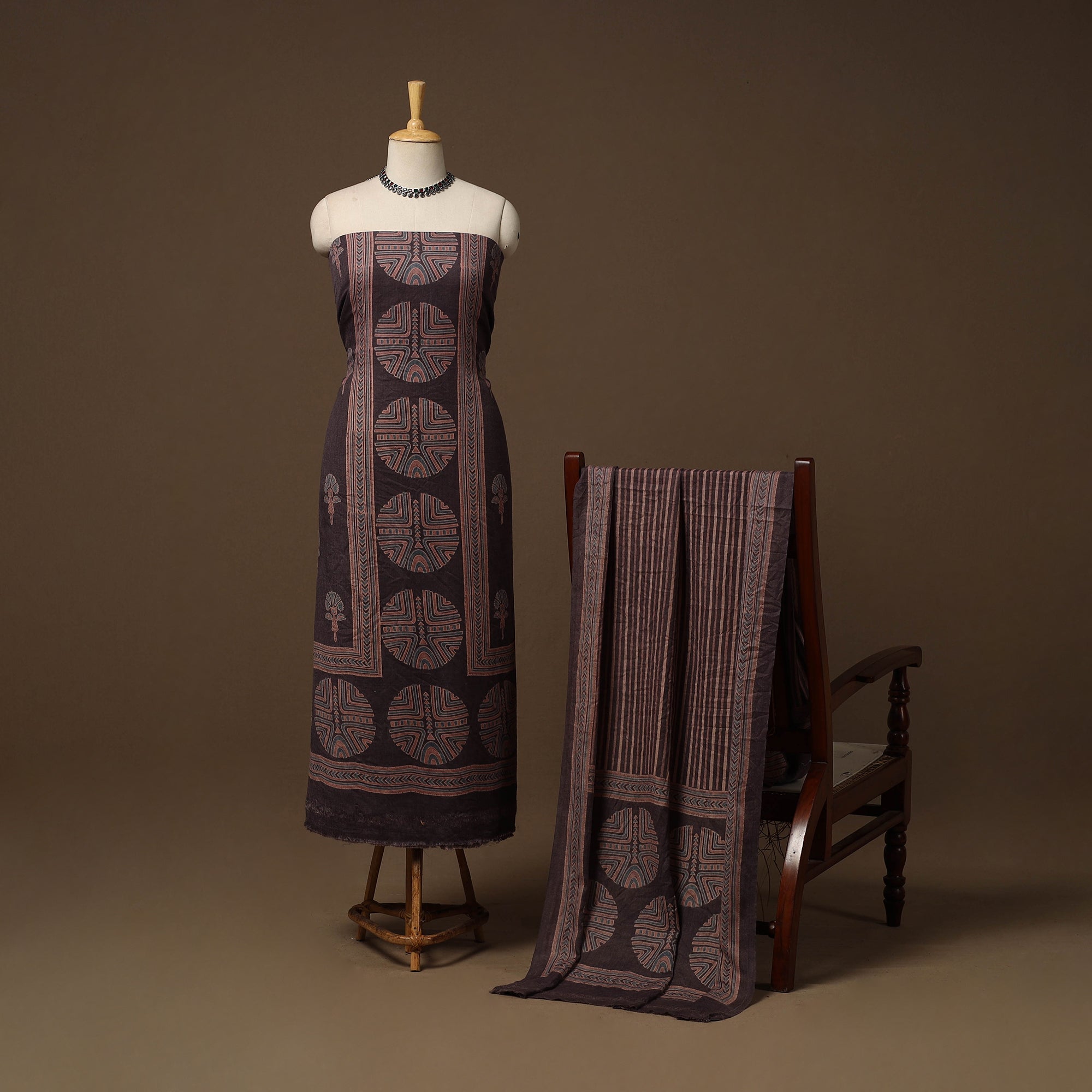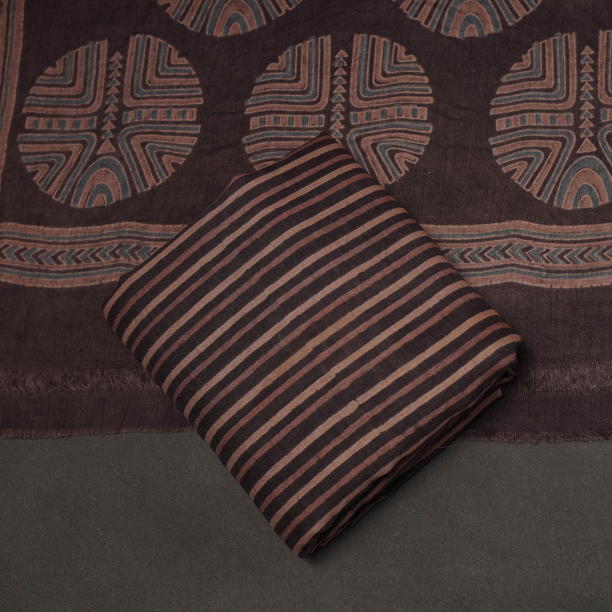 Ajrakh hand block print natural dyed 3pc unstitched dress material, crafted from fine merino wool for the winter season. The fabric is printed using traditional ajrakh techniques practiced by skilled artisans from Kutch, Gujarat. This set includes fabric for a kurta, bottom and dupatta, offering warmth and making it ideal for festive occasions or everyday styling.
