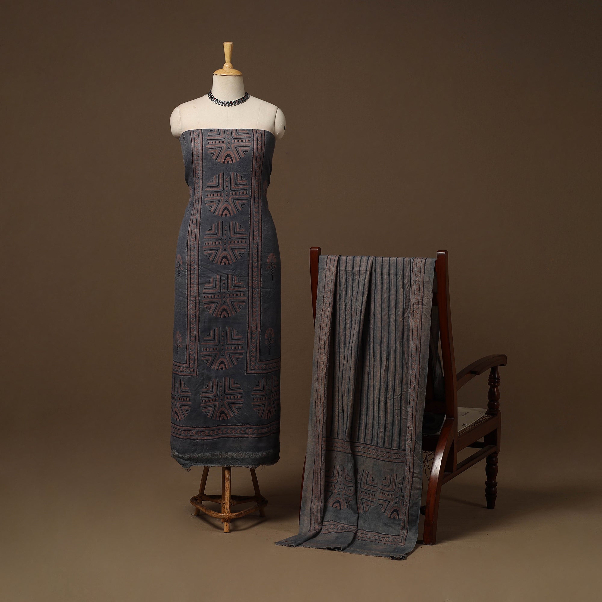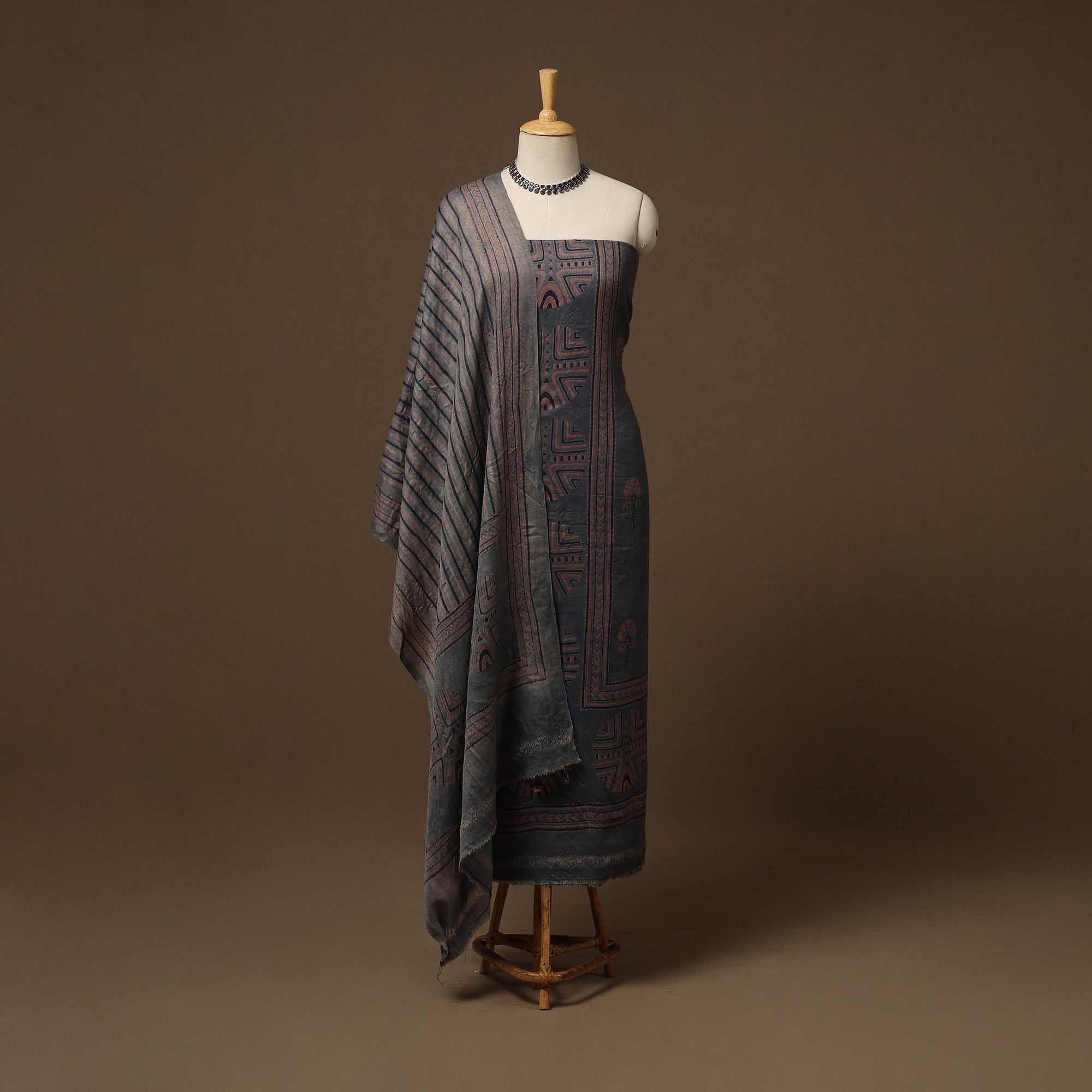 Ajrakh hand block print natural dyed 3pc unstitched dress material, crafted from fine merino wool for the winter season. The fabric is printed using traditional ajrakh techniques practiced by skilled artisans from Kutch, Gujarat. This set includes fabric for a kurta, bottom and dupatta, offering warmth and making it ideal for festive occasions or everyday styling.