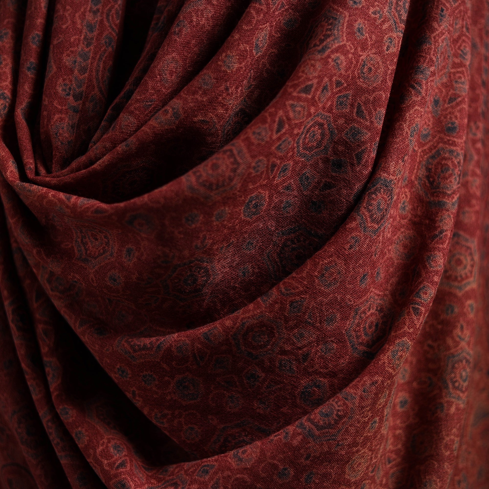 Ajrakh traditional hand block print handwoven natural dyed merino wool shawl is created using long-practiced dyeing and printing techniques from Kutch, Gujarat. Designed for the winter season, the wool offers consistent warmth while remaining comfortable for everyday wear. The intricate Ajrakh patterns bring a refined, understated elegance, making it a thoughtful choice for those who appreciate culturally rooted textiles in their winter wardrobe.