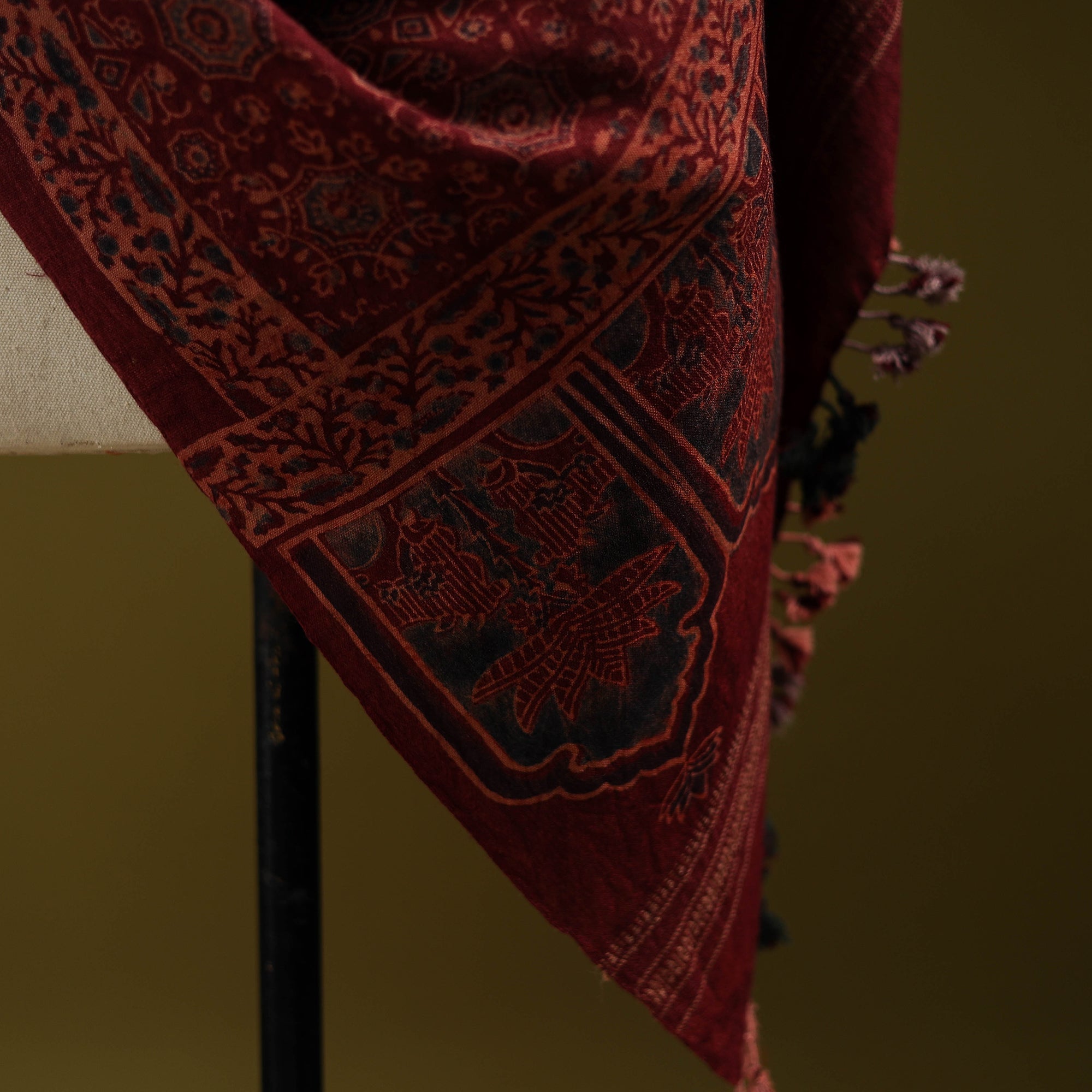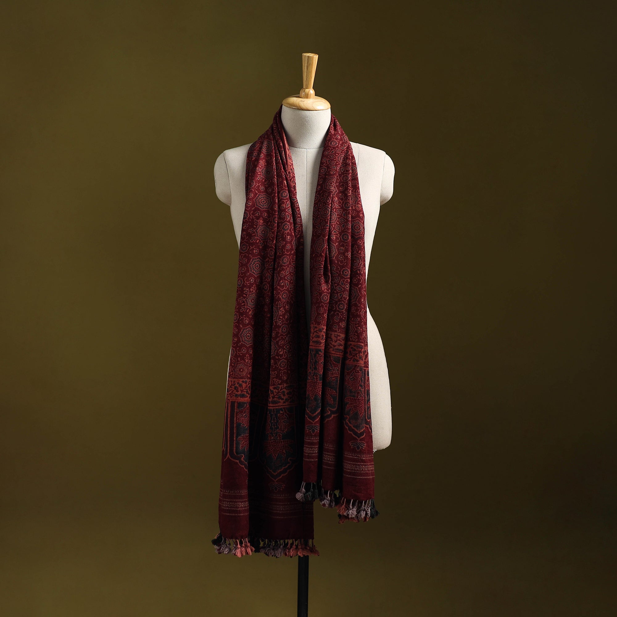 Ajrakh traditional hand block print handwoven natural dyed merino wool shawl is created using long-practiced dyeing and printing techniques from Kutch, Gujarat. Designed for the winter season, the wool offers consistent warmth while remaining comfortable for everyday wear. The intricate Ajrakh patterns bring a refined, understated elegance, making it a thoughtful choice for those who appreciate culturally rooted textiles in their winter wardrobe.