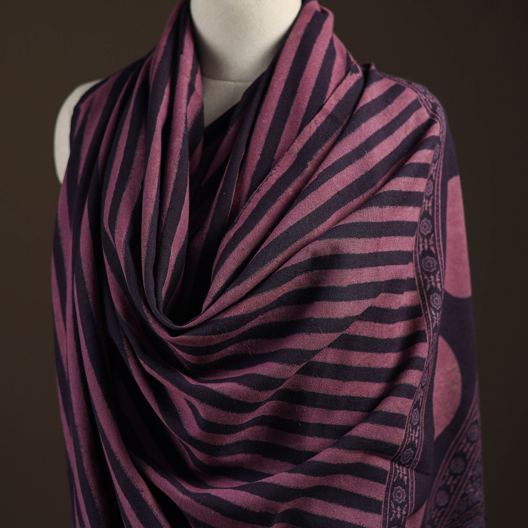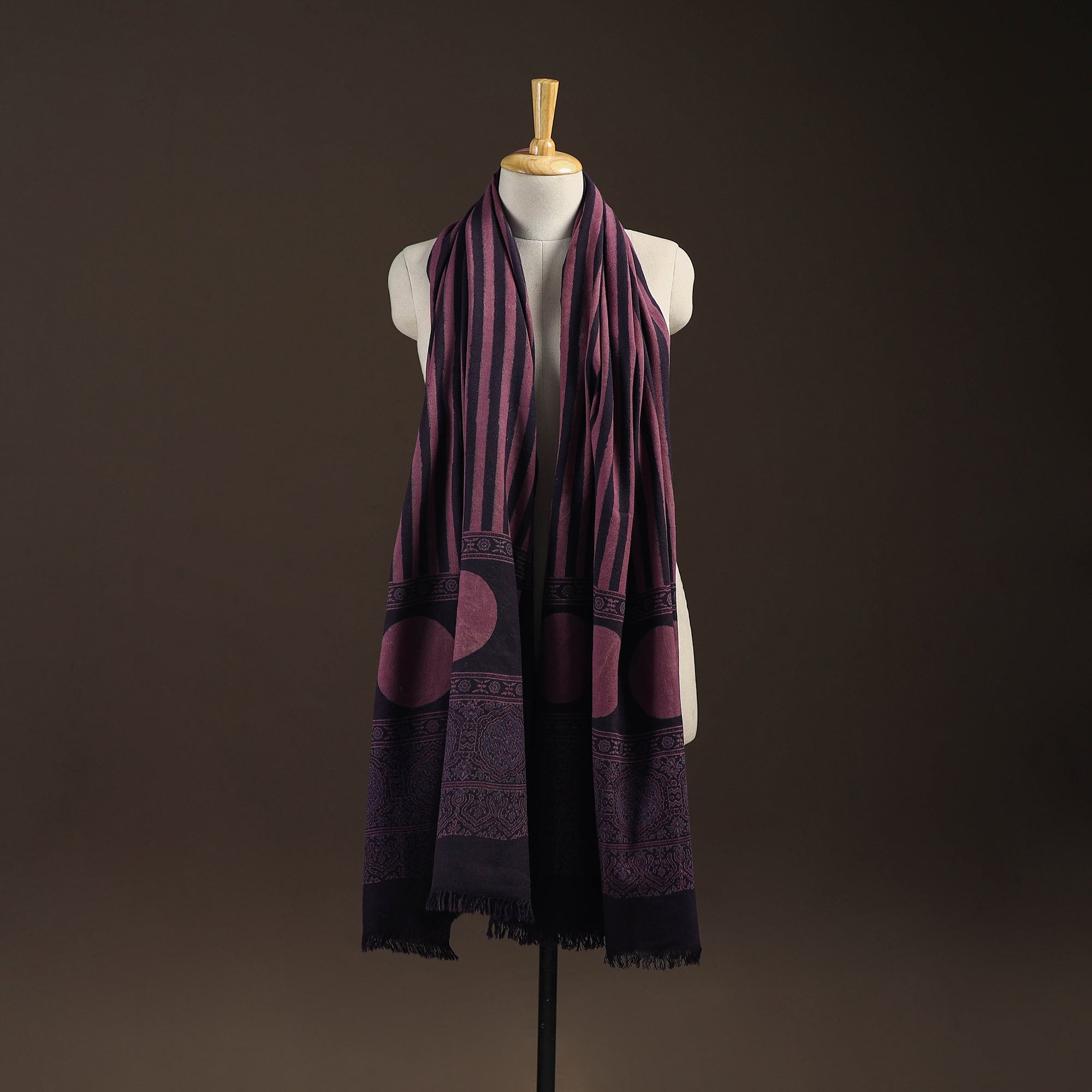 Black ajrakh traditional block print merino wool shawl, made using natural dyes and long-practiced techniques by Harsh from Kutch, Gujarat. Handwoven for the winter season, the wool provides steady warmth and feels comfortable for daily use. Its detailed design adds a clean, elegant look, making it a thoughtful choice for anyone who enjoys culturally rooted textiles for winter wear.