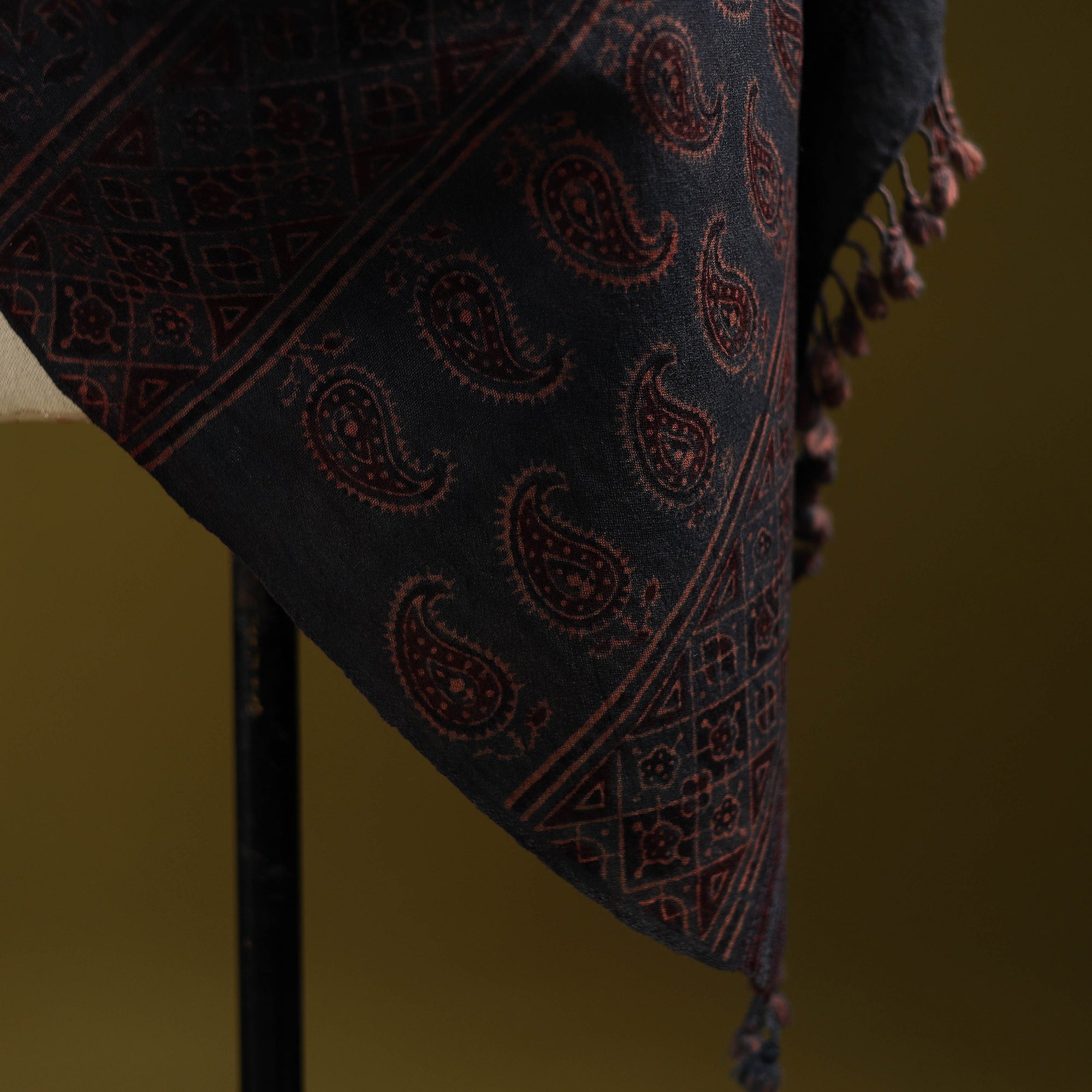 Ajrakh traditional hand block print handwoven natural dyed merino wool shawl is created using long-practiced dyeing and printing techniques from Kutch, Gujarat. Designed for the winter season, the wool offers consistent warmth while remaining comfortable for everyday wear. The intricate Ajrakh patterns bring a refined, understated elegance, making it a thoughtful choice for those who appreciate culturally rooted textiles in their winter wardrobe.