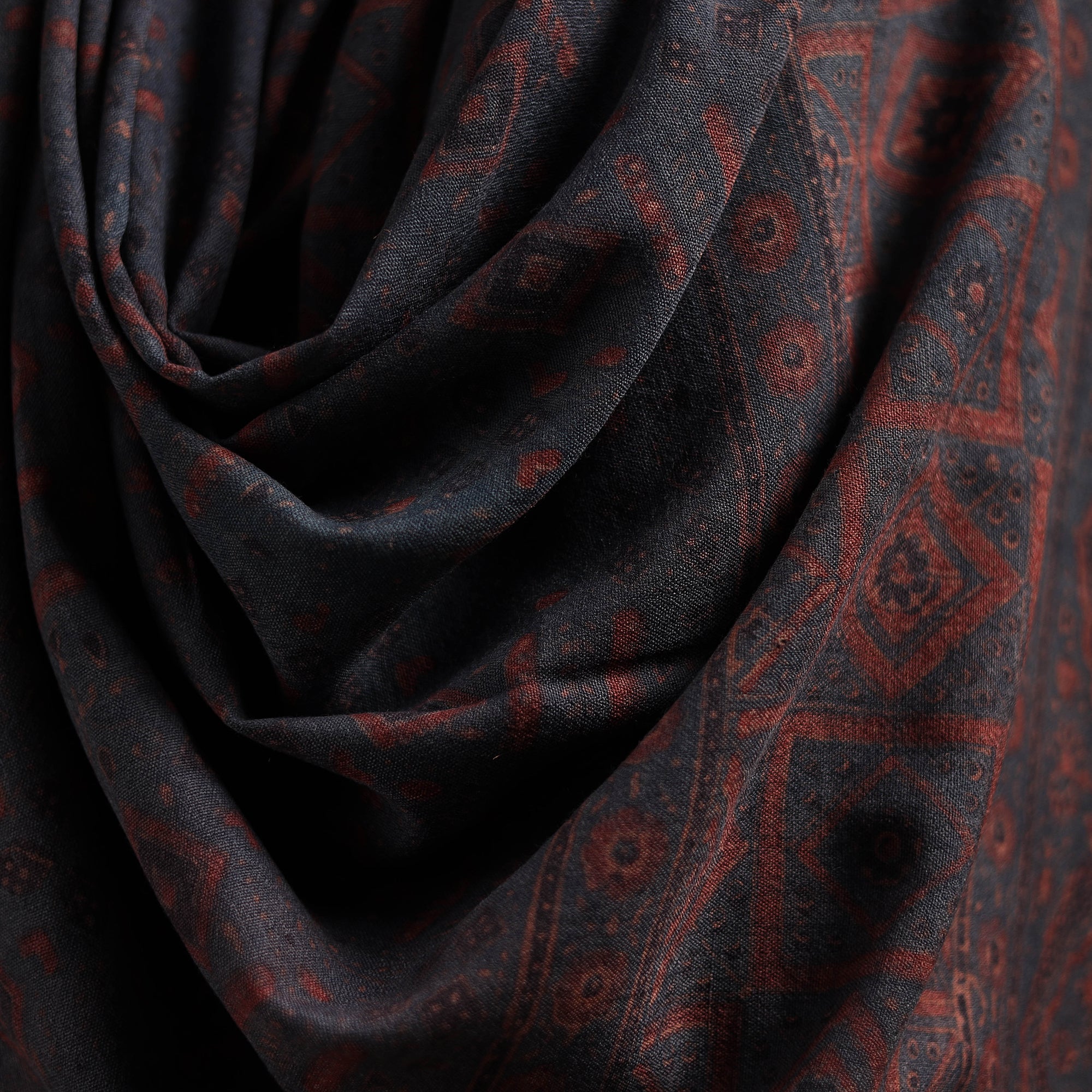 Ajrakh traditional hand block print handwoven natural dyed merino wool shawl is created using long-practiced dyeing and printing techniques from Kutch, Gujarat. Designed for the winter season, the wool offers consistent warmth while remaining comfortable for everyday wear. The intricate Ajrakh patterns bring a refined, understated elegance, making it a thoughtful choice for those who appreciate culturally rooted textiles in their winter wardrobe.