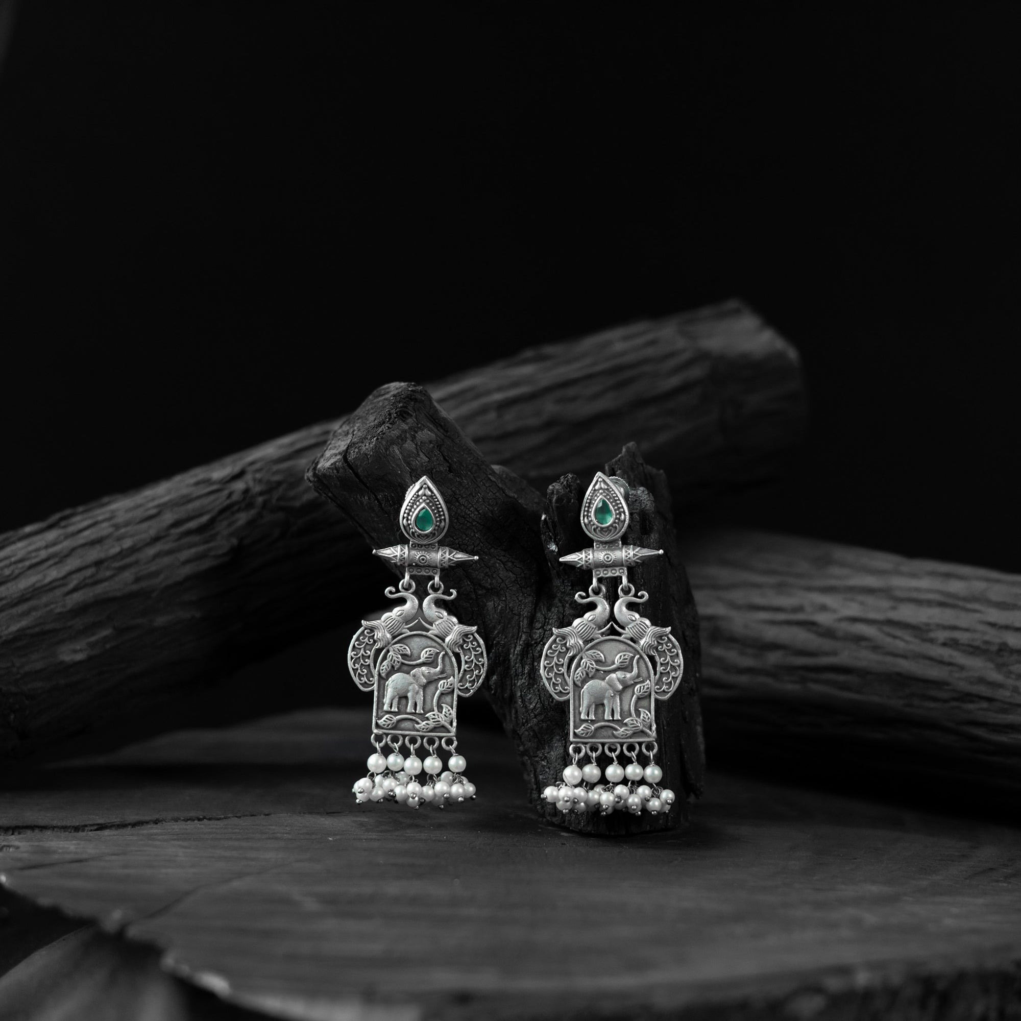 Oxidised handcrafted mint green earrings made with a blend of metal, stones, pearls, beads, and fine detailing. Perfect for festive occasions, weddings, casual outings, office wear, or vacations. Their elegant black and silver tones pair beautifully with everything from casual jeans and flowy dresses to chic office ensembles. A meaningful gift for mother, sister, wife, or girlfriend adding a beautiful touch of tradition to every moment.