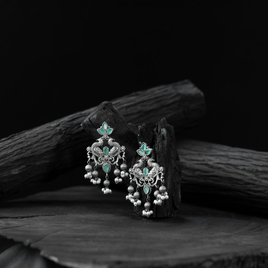 Oxidised handcrafted mint green earrings made with a blend of metal, stones, pearls, beads, and fine detailing. Perfect for festive occasions, weddings, casual outings, office wear, or vacations. Their elegant black and silver tones pair beautifully with everything from casual jeans and flowy dresses to chic office ensembles. A meaningful gift for mother, sister, wife, or girlfriend adding a beautiful touch of tradition to every moment.