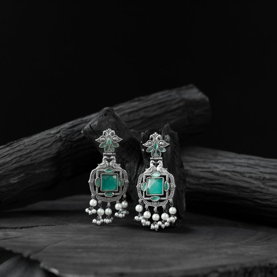 Oxidised handcrafted green earrings made with a blend of metal, stones, pearls, beads, and fine detailing. Perfect for festive occasions, weddings, casual outings, office wear, or vacations. Their elegant black and silver tones pair beautifully with everything from casual jeans and flowy dresses to chic office ensembles. A meaningful gift for mother, sister, wife, or girlfriend adding a beautiful touch of tradition to every moment.