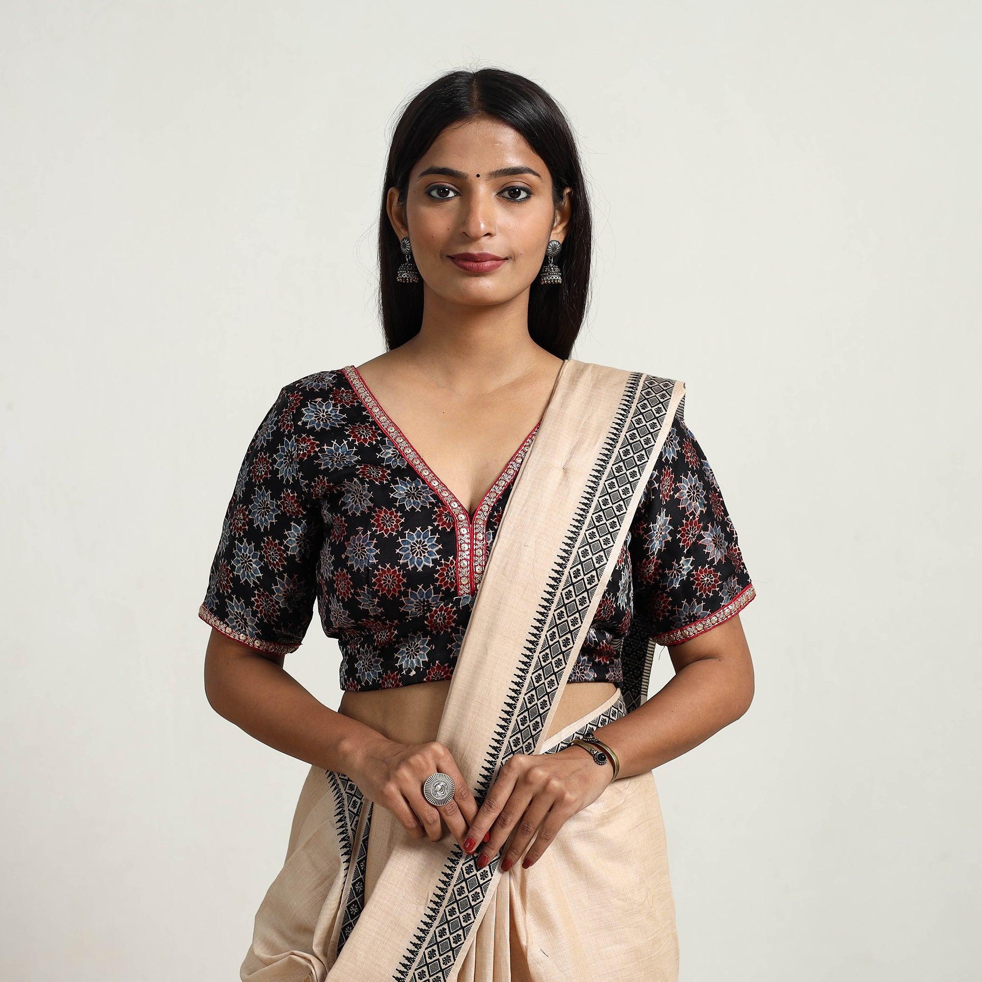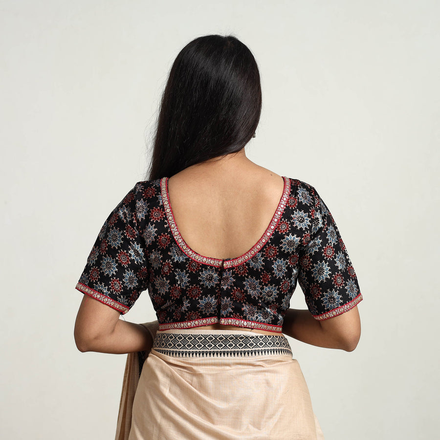 Elevate your wardrobe with this black modal silk block print stitched ajrakh blouse with lace work. Known for its lustrous sheen and softness, this blouse showcases ajrakh block prints using natural dyes in intricate designs crafted by skilled artisans. The half sleeves offer balanced comfort, and the convenient hook lock ensures easy wear. Embrace the elegance of traditional craftsmanship and pair it with your favorite saree or skirt.