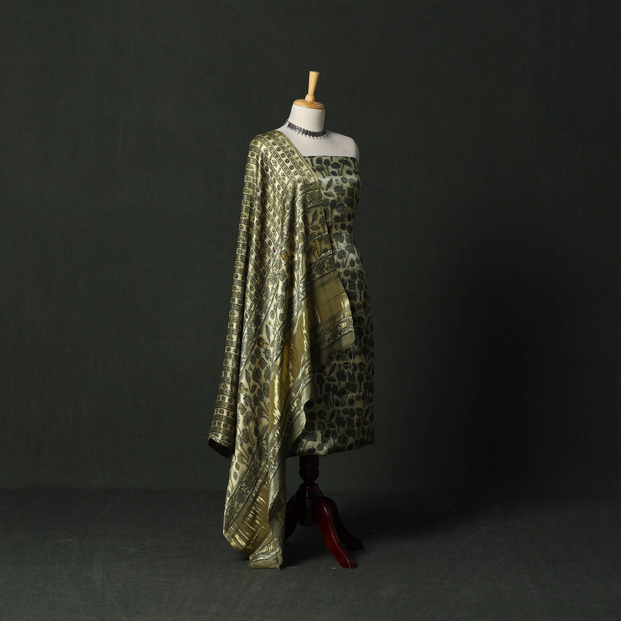 Hand block bagru print natural dyed modal silk 2pc unstitched dress material blends traditional artistry with everyday comfort. It is crafted using the 400–450-year-old Bagru printing technique from Rajasthan, where skilled artisans apply a hand-prepared mud resist using intricately carved wooden blocks. Once dyed and washed, the resist reveals distinctive motifs in soft, earthy tones. The set includes kurta fabric and a dupatta with zari patta. The modal silk fabric offers comfort throughout the day, making this set suitable for both daily wear and special occasions.
