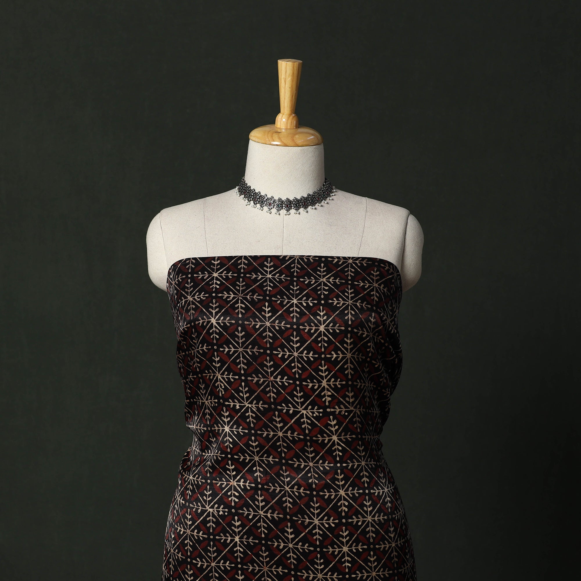 Hand block bagru print natural dyed modal silk 2pc unstitched dress material blends traditional artistry with everyday comfort. It is crafted using the 400–450-year-old Bagru printing technique from Rajasthan, where skilled artisans apply a hand-prepared mud resist using intricately carved wooden blocks. Once dyed and washed, the resist reveals distinctive motifs in soft, earthy tones. The set includes kurta fabric and a dupatta with zari patta. The modal silk fabric offers comfort throughout the day, making this set suitable for both daily wear and special occasions.