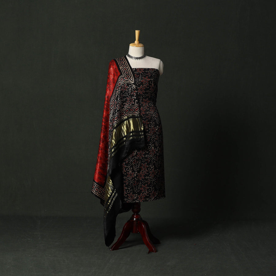 Hand block bagru print natural dyed modal silk 2pc unstitched dress material blends traditional artistry with everyday comfort. It is crafted using the 400–450-year-old Bagru printing technique from Rajasthan, where skilled artisans apply a hand-prepared mud resist using intricately carved wooden blocks. Once dyed and washed, the resist reveals distinctive motifs in soft, earthy tones. The set includes kurta fabric and a dupatta with zari patta. The modal silk fabric offers comfort throughout the day, making this set suitable for both daily wear and special occasions.
