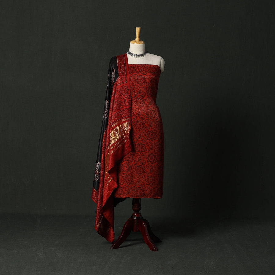 Hand block bagru print natural dyed modal silk 2pc unstitched dress material blends traditional artistry with everyday comfort. It is crafted using the 400–450-year-old Bagru printing technique from Rajasthan, where skilled artisans apply a hand-prepared mud resist using intricately carved wooden blocks. Once dyed and washed, the resist reveals distinctive motifs in soft, earthy tones. The set includes kurta fabric and a dupatta with zari patta. The modal silk fabric offers comfort throughout the day, making this set suitable for both daily wear and special occasions.