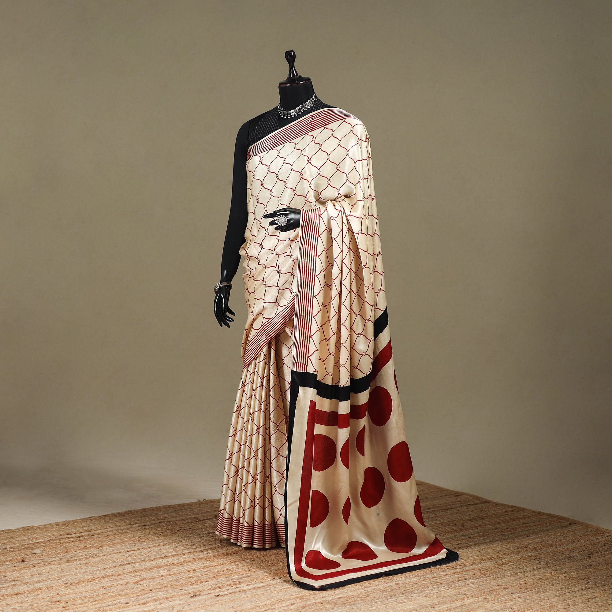 • Beige - Modal Silk Hand Block Print Bagru Saree 06