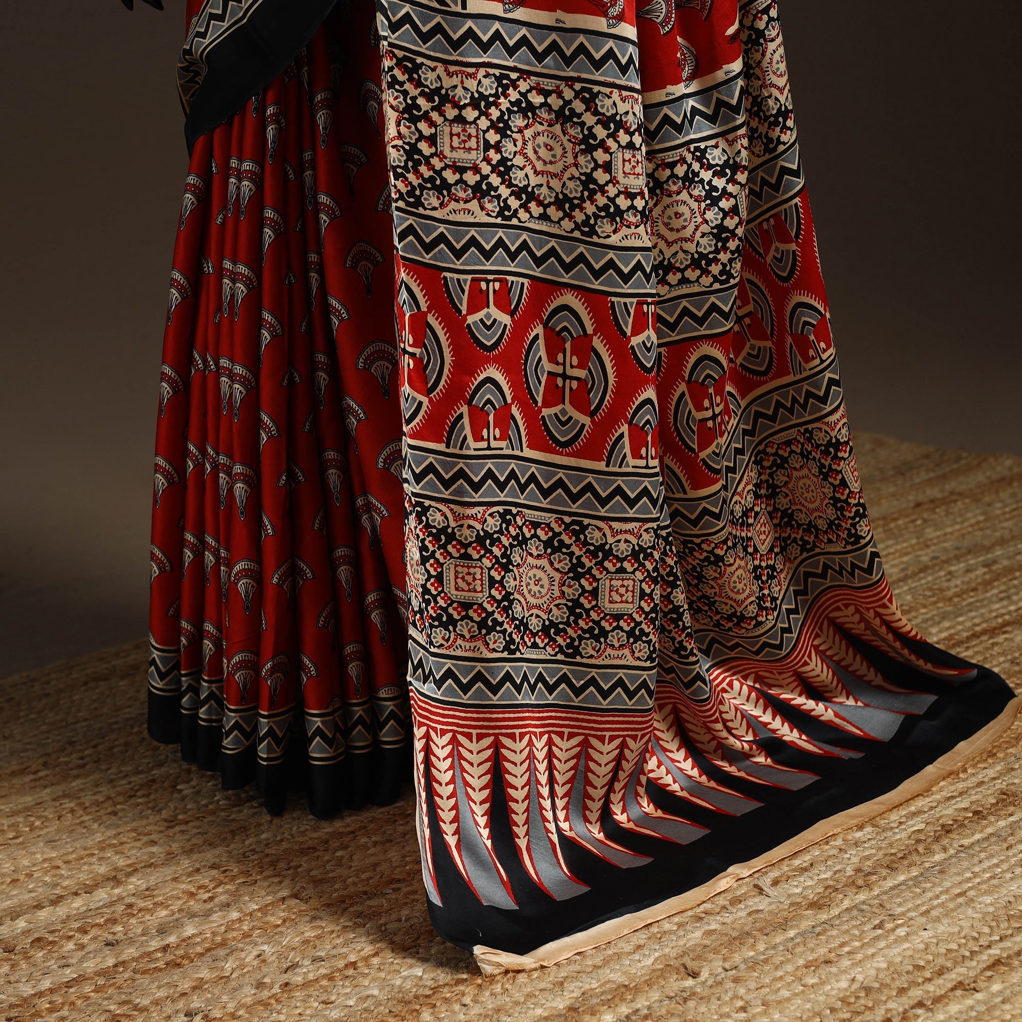 This red modal silk saree features traditional bagru block printing, known for its bold patterns. Made using hand-carved wooden blocks and natural dyes, it drapes smoothly and feels soft to wear. Originating from Bagru, a village near Jaipur in Rajasthan, this printing style has been practiced for generations. Suitable for both everyday wear and special occasions, it beautifully blends comfort and style.