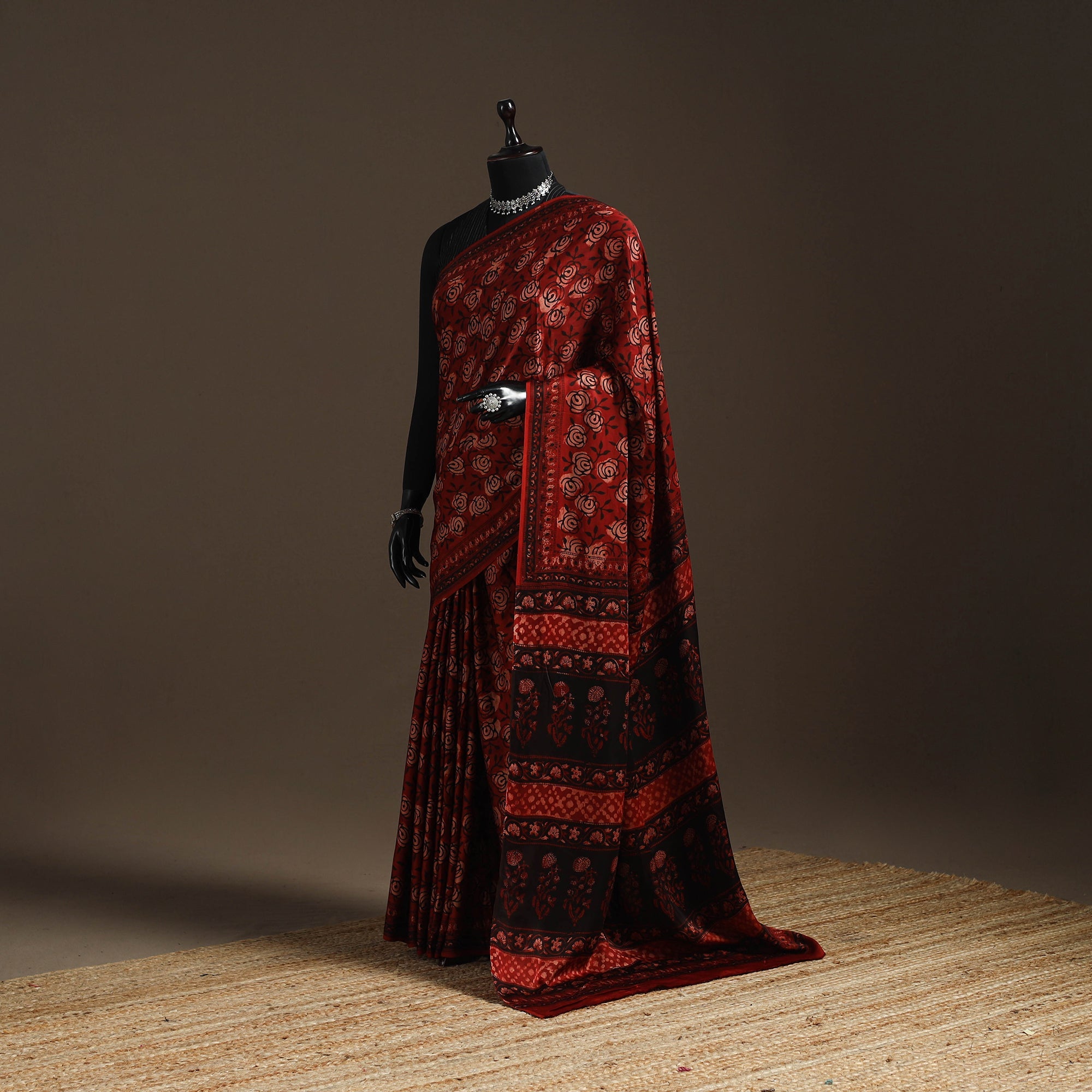 This red modal silk saree features traditional bagru block printing, known for its bold patterns. Made using hand-carved wooden blocks and natural dyes, it drapes smoothly and feels soft to wear. Originating from Bagru, a village near Jaipur in Rajasthan, this printing style has been practiced for generations. Suitable for both everyday wear and special occasions, it beautifully blends comfort and style.