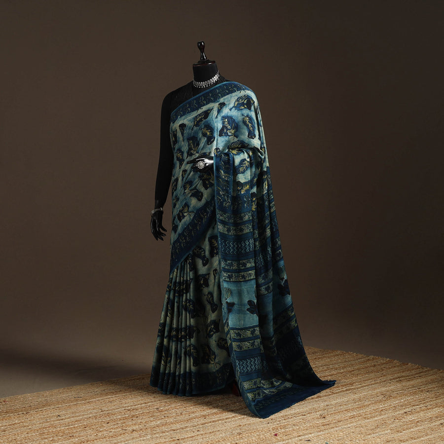 This blue modal silk saree features traditional bagru block printing, known for its bold patterns. Made using hand-carved wooden blocks and natural dyes, it drapes smoothly and feels soft to wear. Originating from Bagru, a village near Jaipur in Rajasthan, this printing style has been practiced for generations. Suitable for both everyday wear and special occasions, it beautifully blends comfort and style.