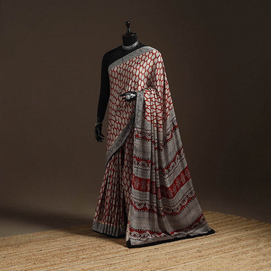 This red modal silk saree features traditional bagru block printing, known for its bold patterns. Made using hand-carved wooden blocks and natural dyes, it drapes smoothly and feels soft to wear. Originating from Bagru, a village near Jaipur in Rajasthan, this printing style has been practiced for generations. Suitable for both everyday wear and special occasions, it beautifully blends comfort and style.