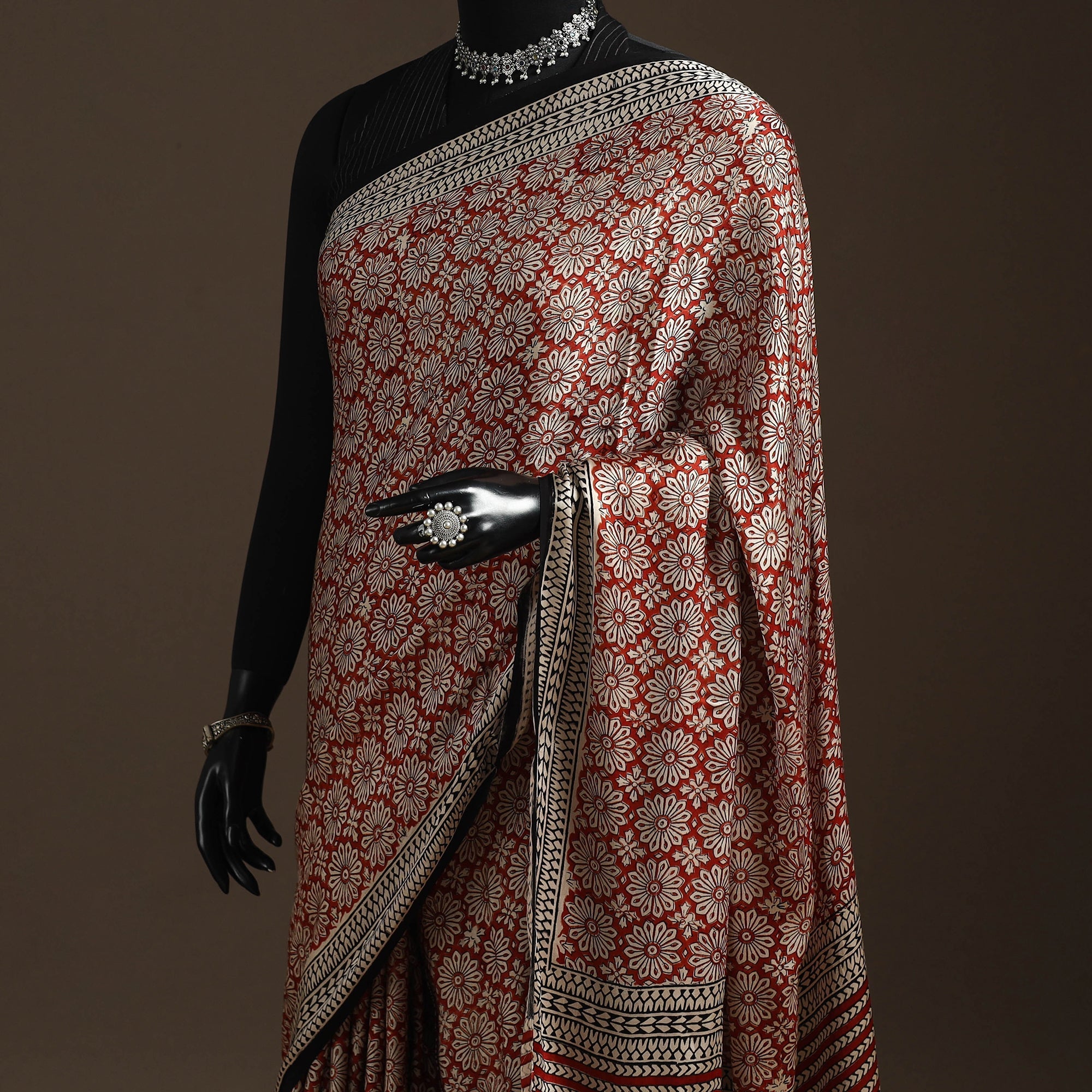 This red modal silk saree features traditional bagru block printing, known for its bold patterns. Made using hand-carved wooden blocks and natural dyes, it drapes smoothly and feels soft to wear. Originating from Bagru, a village near Jaipur in Rajasthan, this printing style has been practiced for generations. Suitable for both everyday wear and special occasions, it beautifully blends comfort and style.