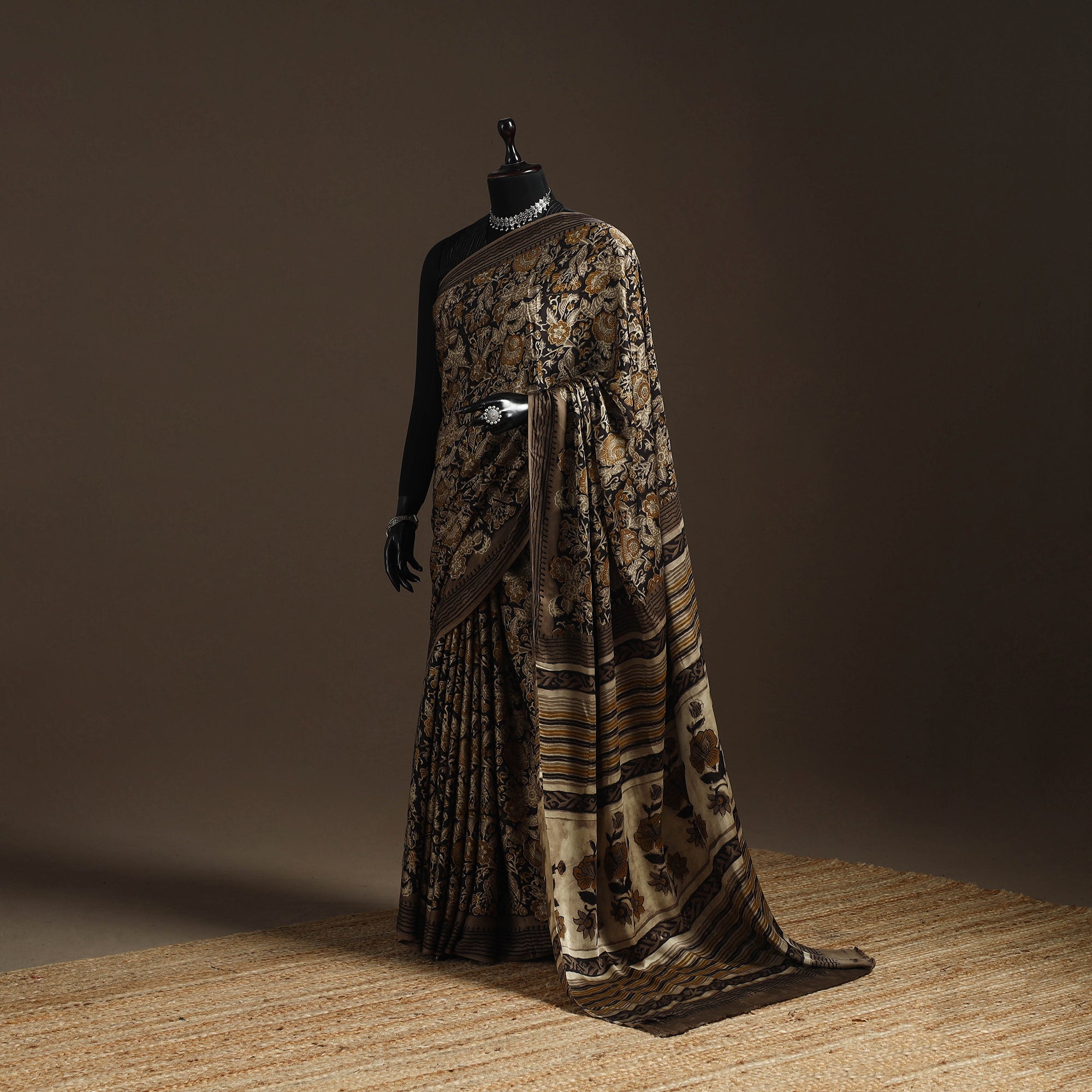 This brown modal silk saree features traditional bagru block printing, known for its bold patterns. Made using hand-carved wooden blocks and natural dyes, it drapes smoothly and feels soft to wear. Originating from Bagru, a village near Jaipur in Rajasthan, this printing style has been practiced for generations. Suitable for both everyday wear and special occasions, it beautifully blends comfort and style.
