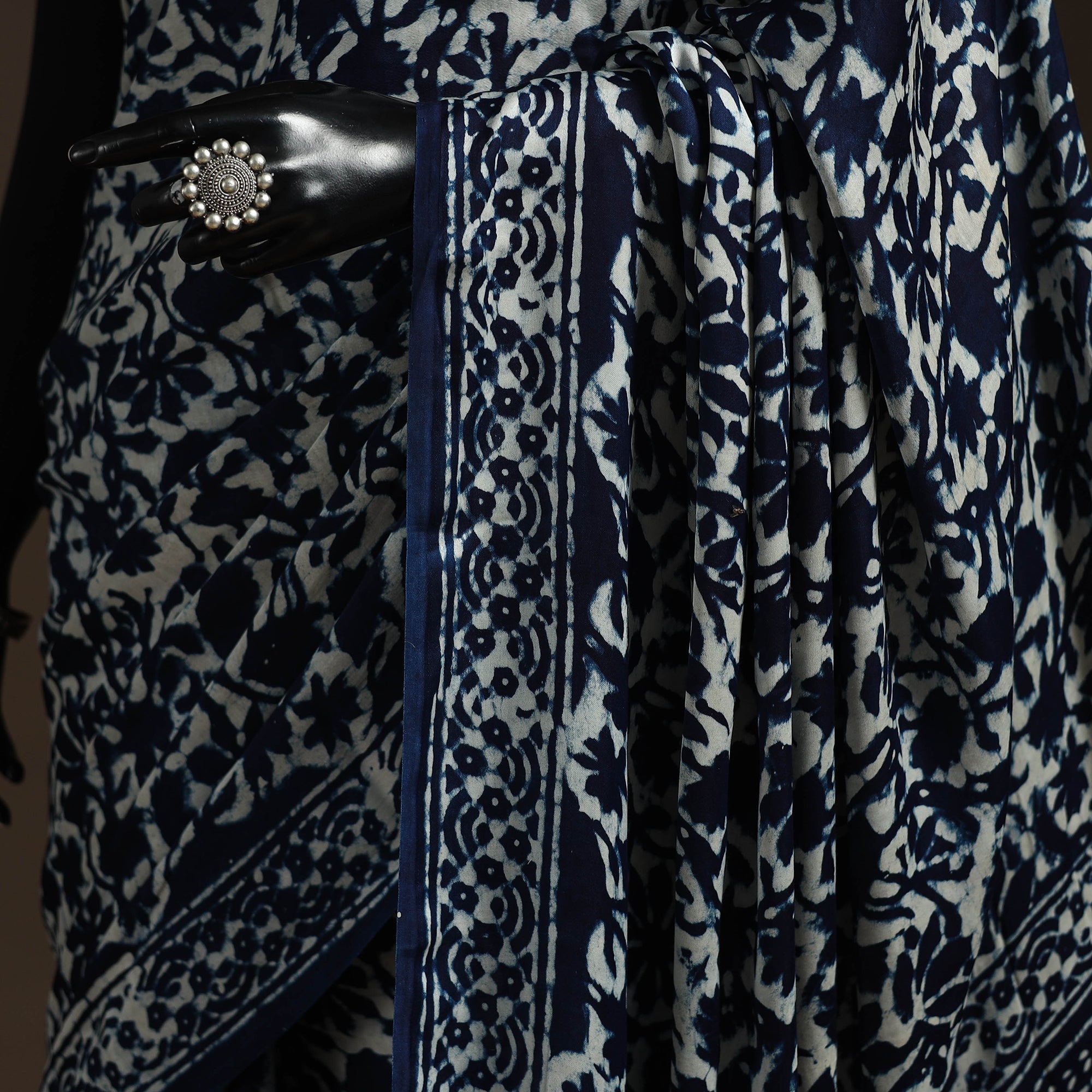 This blue modal silk saree features traditional indigo bagru block printing, known for its bold patterns. Made using hand-carved wooden blocks and natural dyes, it drapes smoothly and feels soft to wear. Originating from Bagru, a village near Jaipur in Rajasthan, this printing style has been practiced for generations. Suitable for both everyday wear and special occasions, it beautifully blends comfort and style.