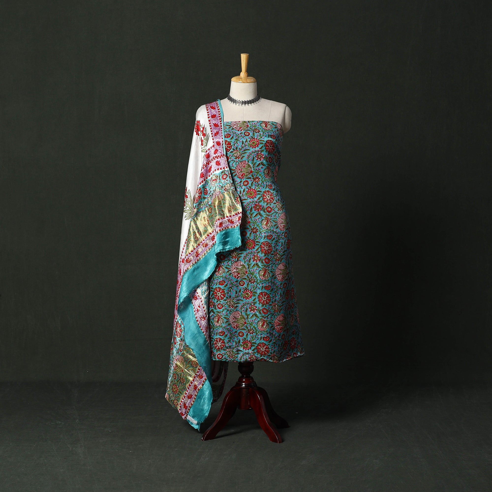 Hand block sanganeri print modal silk 2pc unstitched dress material blends traditional artistry with everyday comfort. It is created using the traditional hand block printing technique of Sanganer, a historic town in the southern part of Jaipur, Rajasthan. Practised for over 500 years, this craft is carried forward by skilled artisans, with techniques passed down through generations. Fine patterns are produced using intricately hand-carved wooden blocks. The set includes kurta fabric and a dupatta with zari patta. The modal silk fabric offers comfort throughout the day, making this set suitable for both daily wear and special occasions.