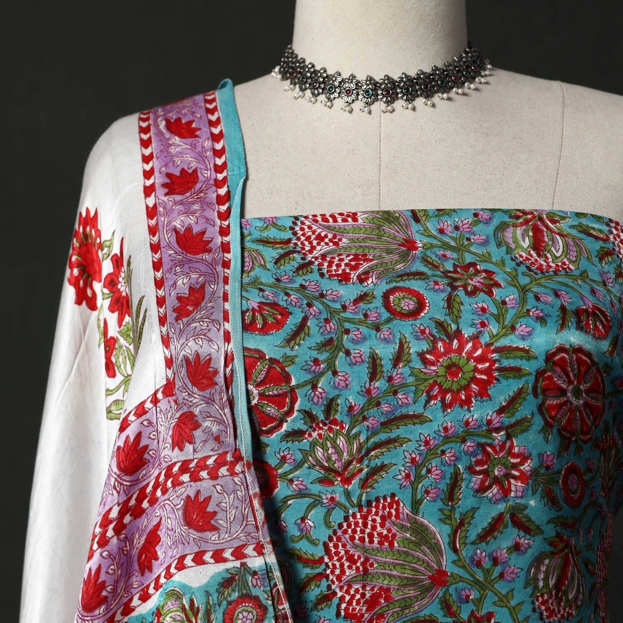 • Modal silk hand block sanganeri print 2pc unstitched dress