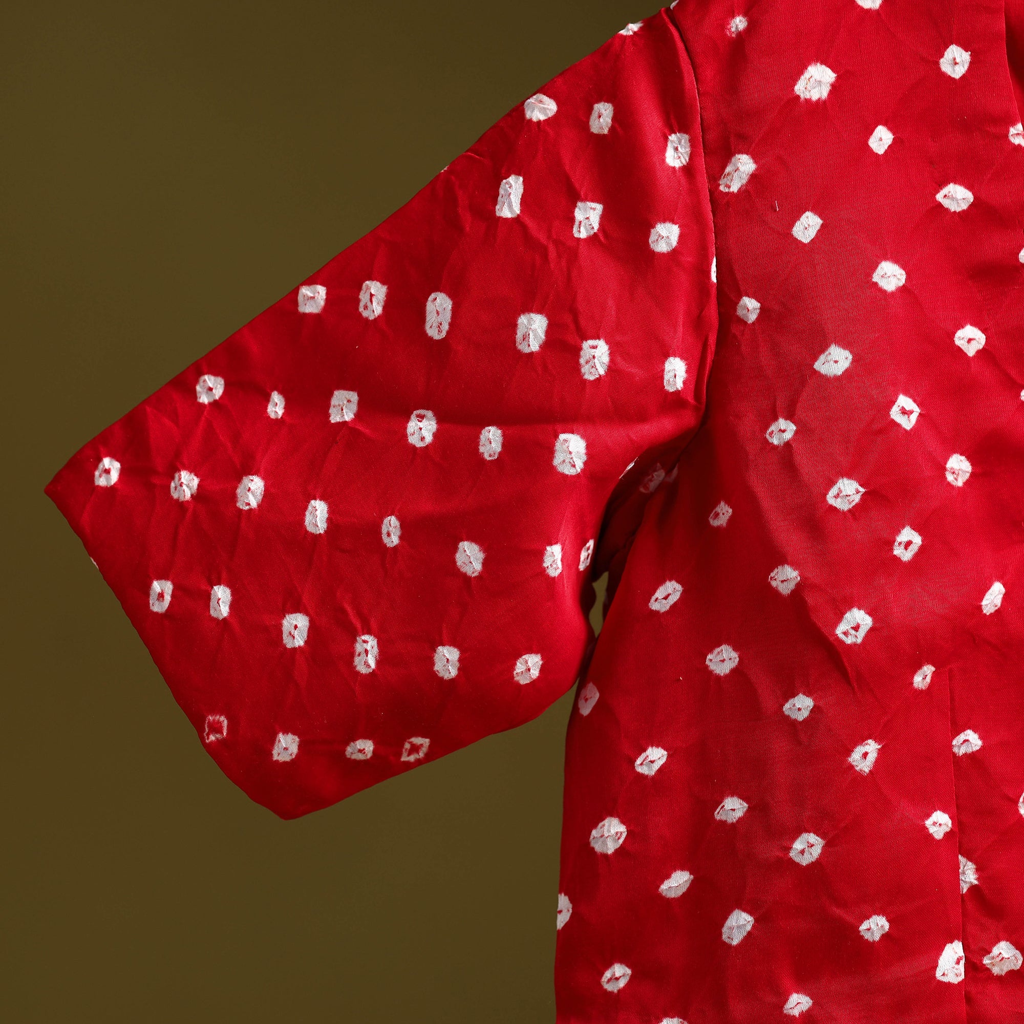 Red bandhani tie-dye stitched blouse is made from smooth, lustrous modal silk fabric. Crafted using the traditional bandhani technique of tie and dye, it features fine patterns that bring out vibrant colour tones. The blouse has elegant half sleeves and a front hook closure for comfort and ease. Its neat finish and elegant texture make it ideal for festive and special occasions.