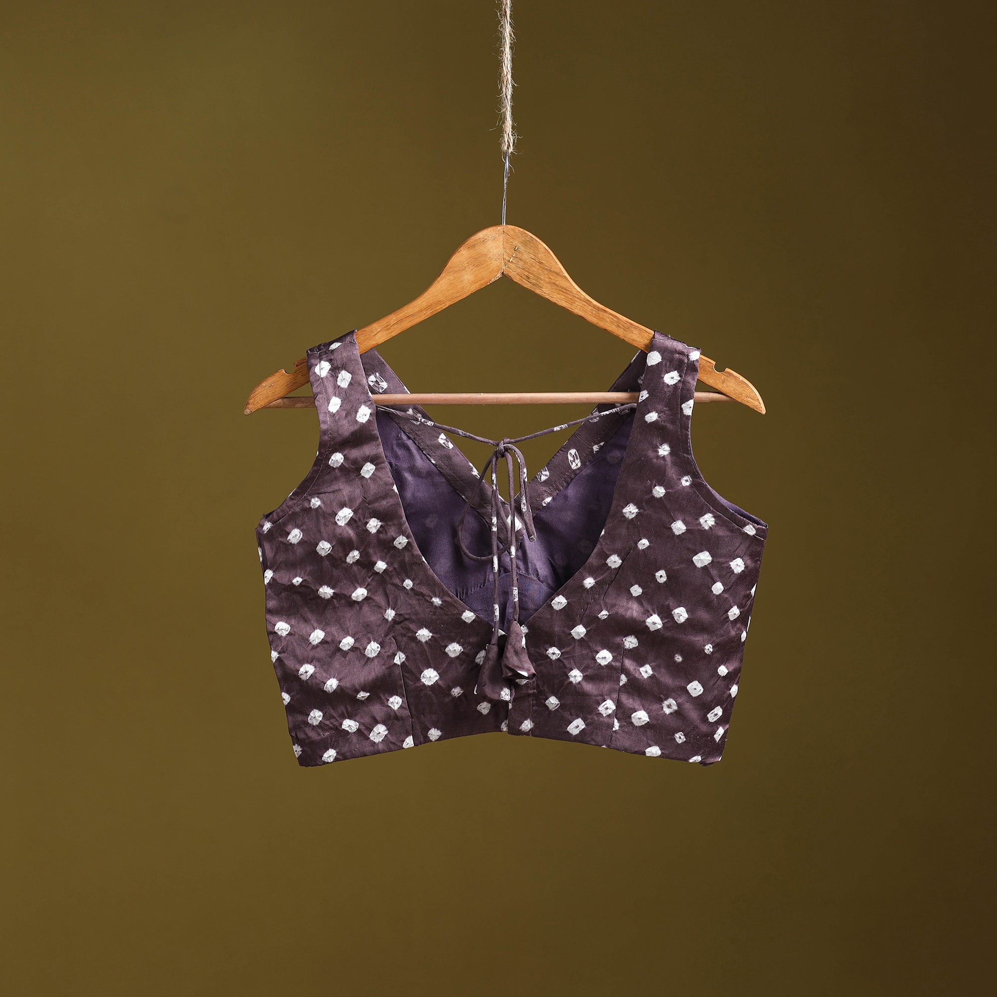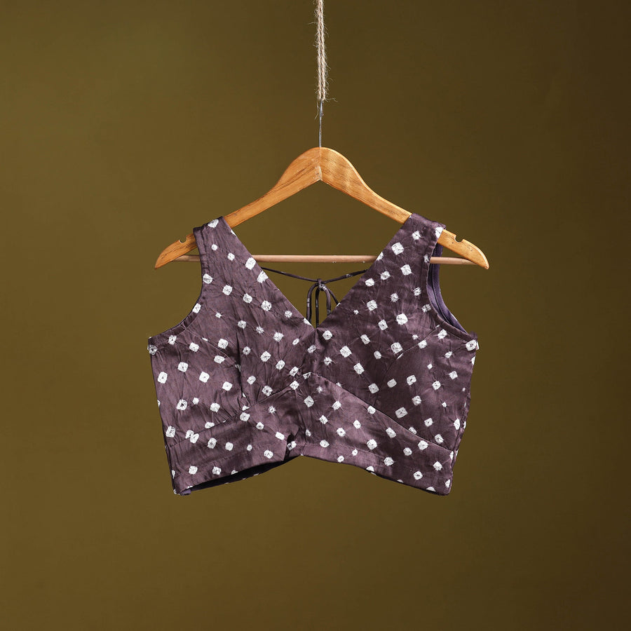 Purple bandhani tie-dye stitched blouse is made from smooth, lustrous modal silk fabric. Crafted using the traditional bandhani technique of tie and dye, it features fine patterns that bring out vibrant colour tones. The blouse is sleeveless and designed with a back hook and dori for a perfect fit. Its neat finish and elegant texture make it ideal for festive and special occasions.